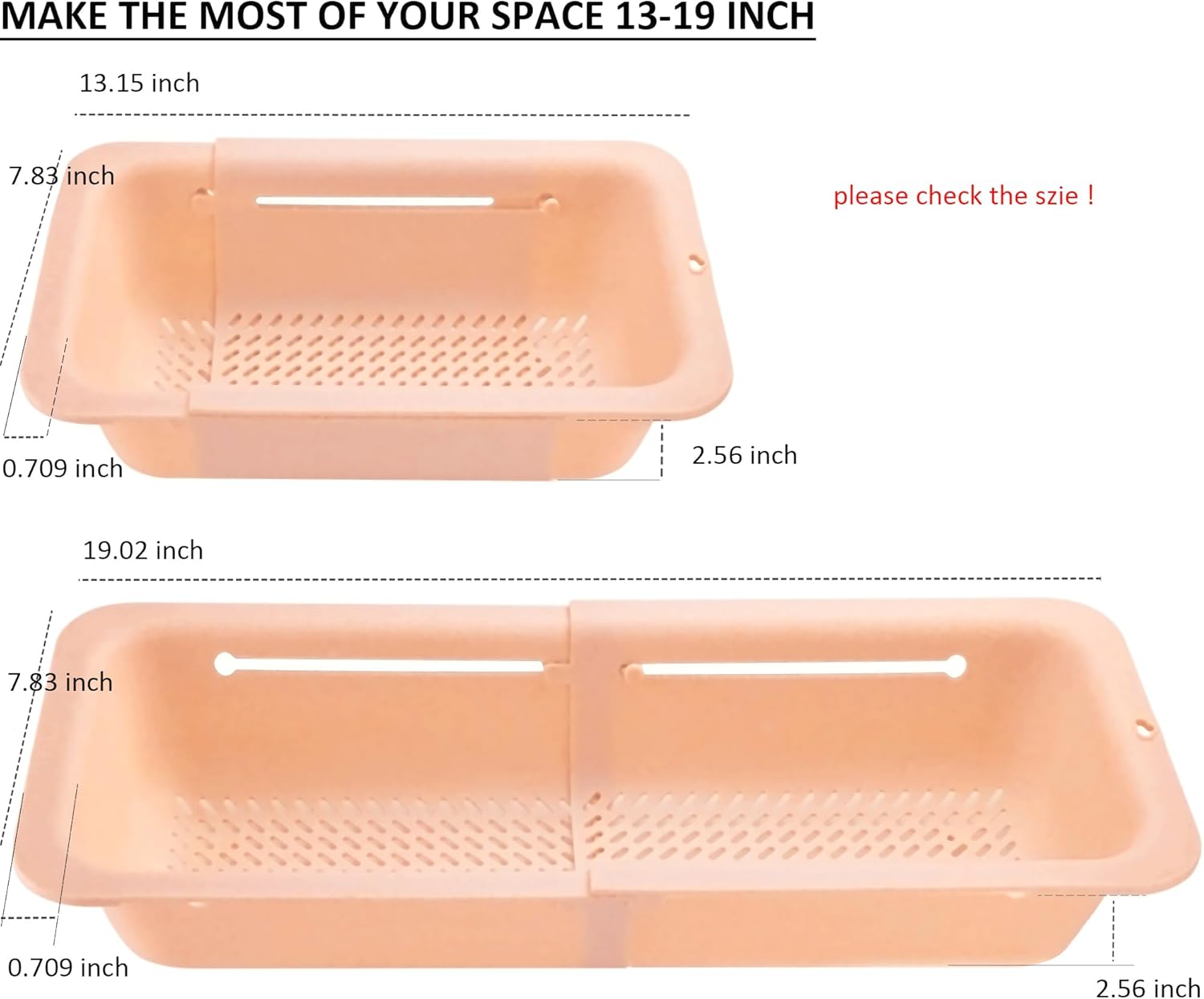 - LASSHSWA Over the sink extendable strainer, SIZE: 13-19 in (smaller space-saving design) . Stainless steel drain strainer, SIZE: Outer diameter: 4.5”; inner filter: 3”; depth: 1” . They fit for most kitchen sinks and drains.