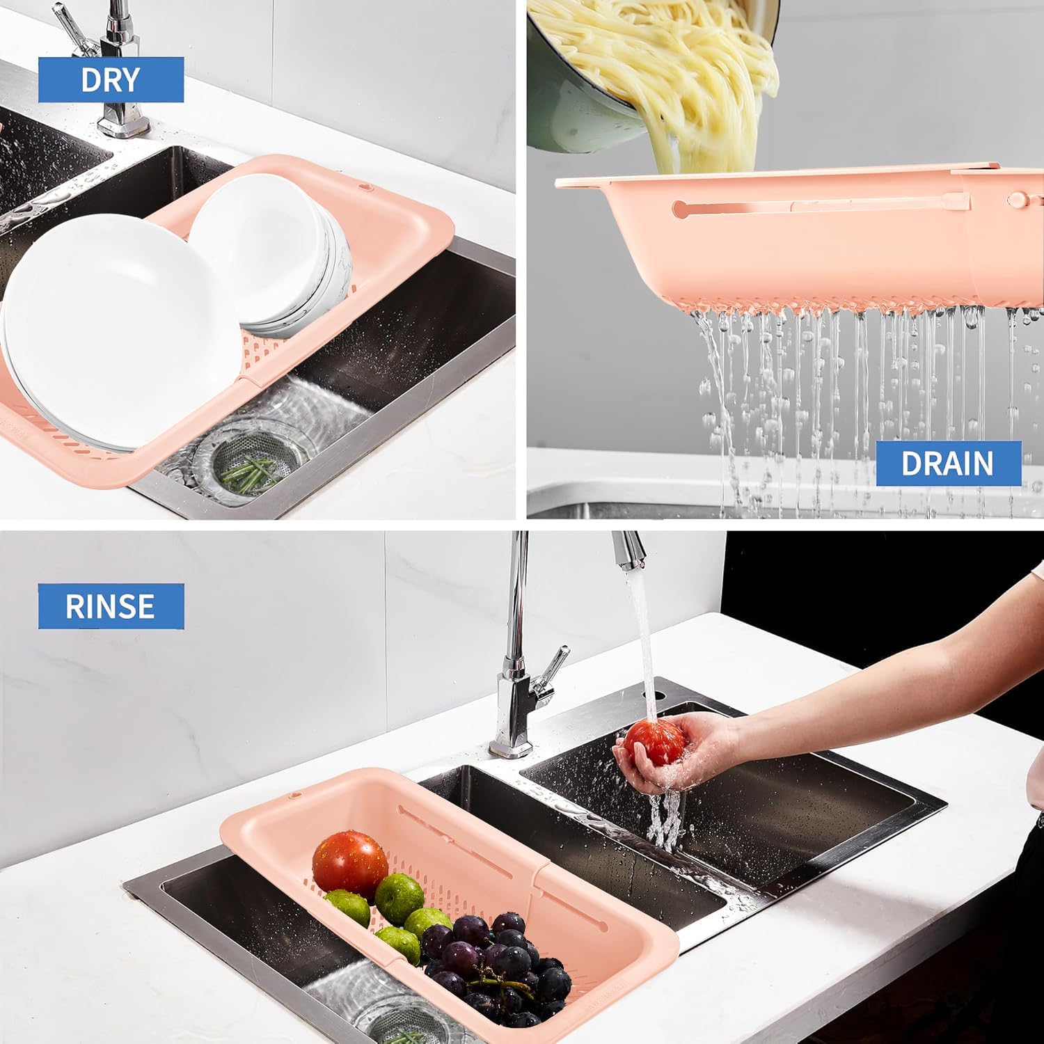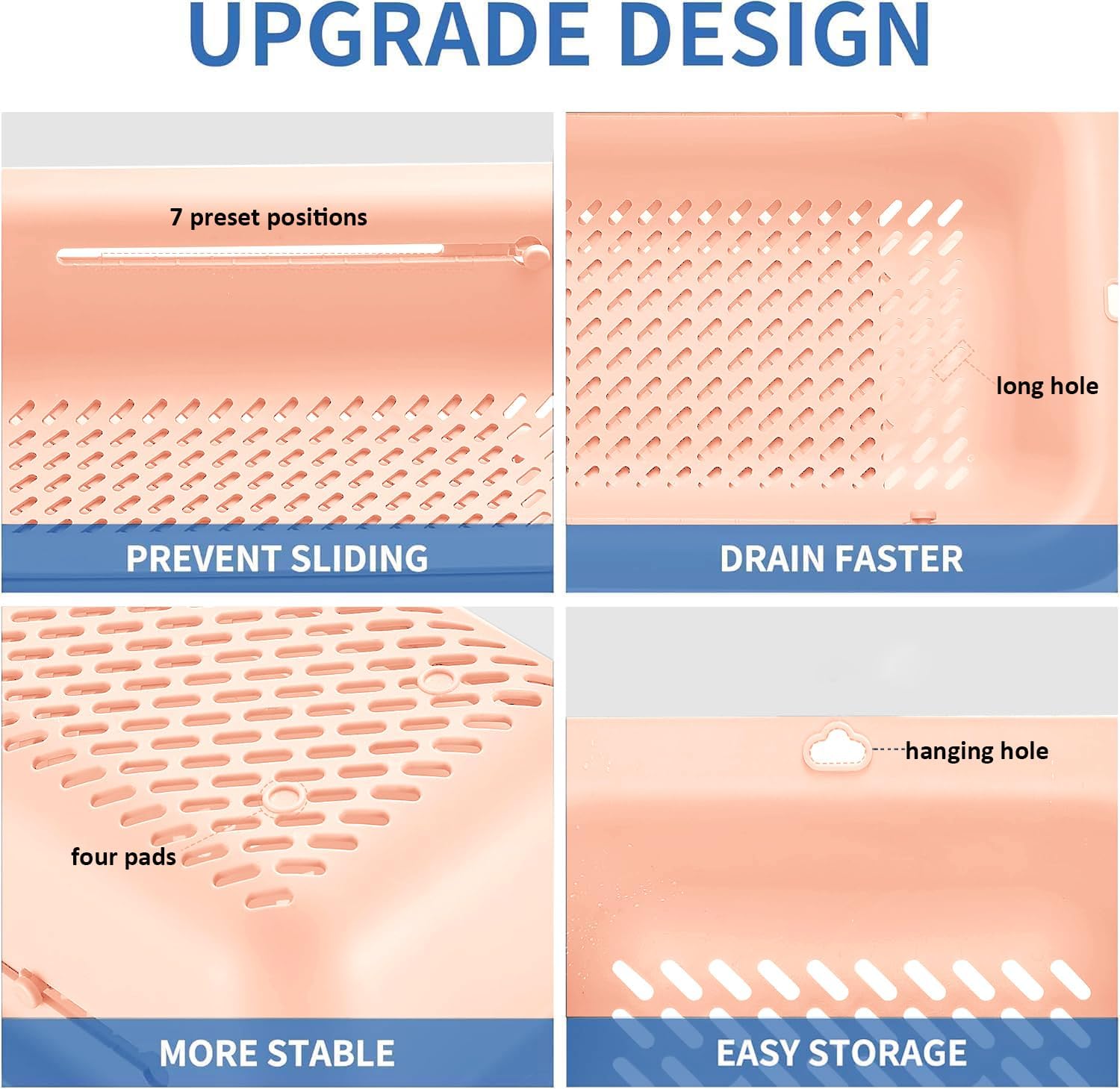 - LASSHSWA upgrade the colander, 7 preset positions - PREVENT SLIDING, long hole - DRAIN FASTER, four pads - MORE STABLE, hanging hole - EASY STORAGE.