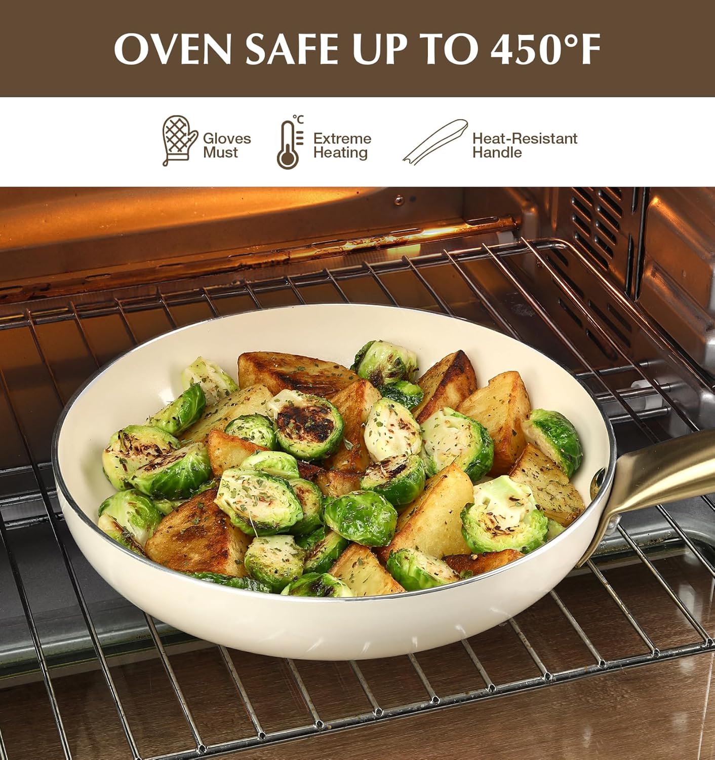 KOCH SYSTEME CS Nonstick Frying Pan with Lid, 8 Inch Non-Stick Skillet with Gold Stay-Cool Stainless Steel Handle, Omelet Pan with Nonstick Ceramic Coating, PFOA Free, Oven Safe, Cream White