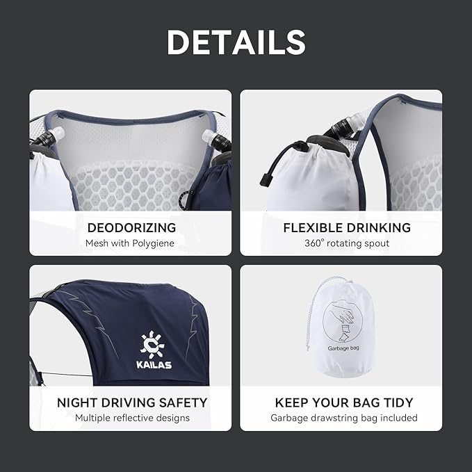 - LIGHTWEIGHT DESIGN: The backpack weight is only 230g(Medium Size), which is mainly suitable for trail running, as well as running, marathon, and light hiking. Equipped with Two 500ml TPU soft kettles, a single weight of 38g, the outward spout can rotate 360°, convenient for drinking water, when the water volume of the bottle is low, the kettle silo can be contracted, and the kettle can be stabilized without shaking, reducing interference to trail runners