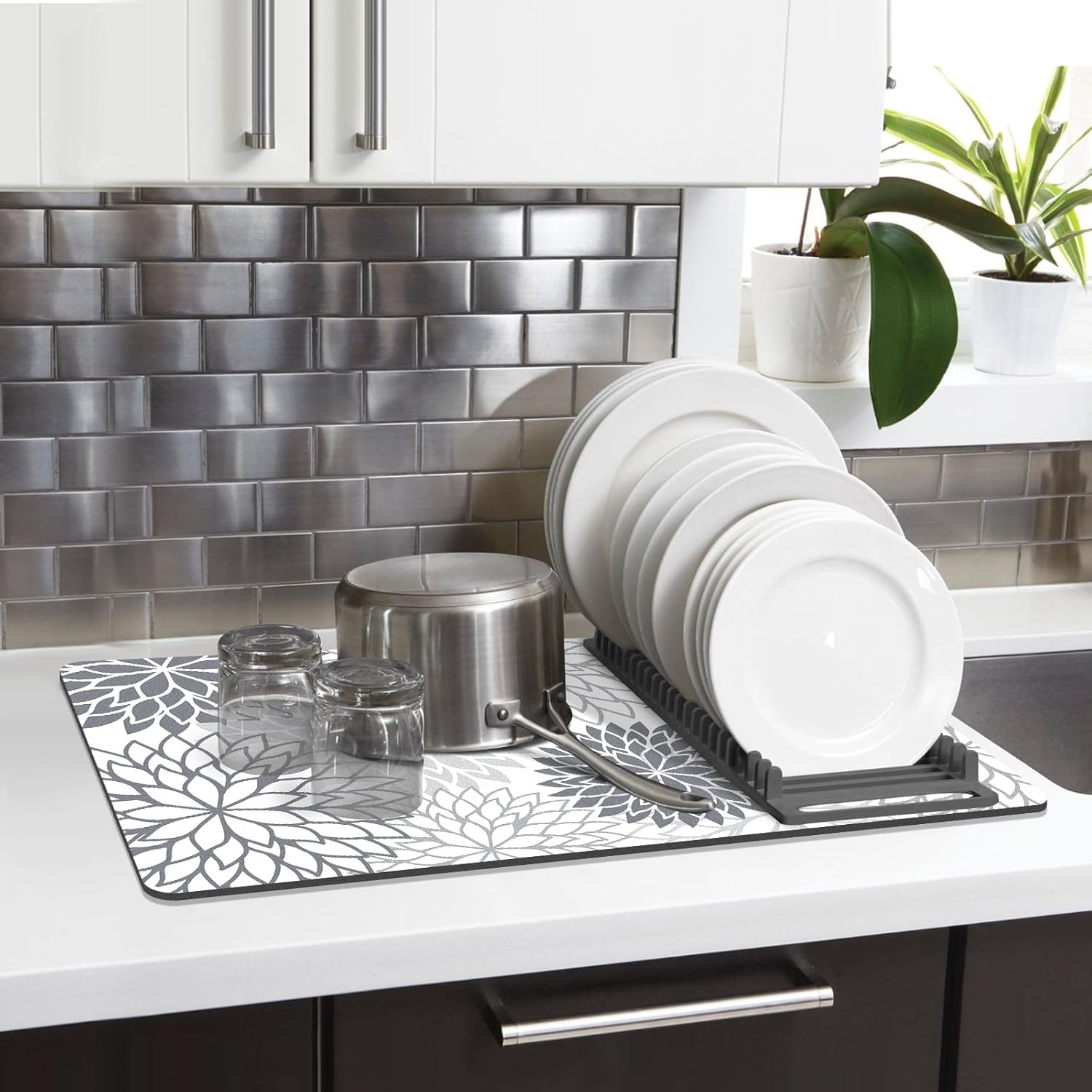 - 【Innovative Design】The dish drying mats by Findosom feature a stylish, luxuriant flowers pattern design and are available in a variety of colors. Not only is it a drying matt kitchen counter, but you can also use it as a decorative piece that complements any kitchen decor or enhances the beauty of your coffee bar table or desk
