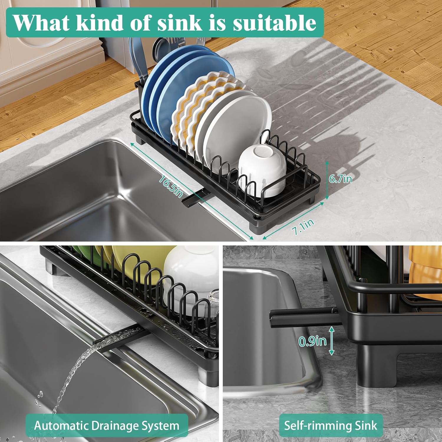 Giwil Small Dish Drying Rack, Compact Dish Rack with Drainboard for Kitchen Counter, Multifunctional Rustproof Dish Drainer Plate Organizer Used Over Sink & on Countertop, Black