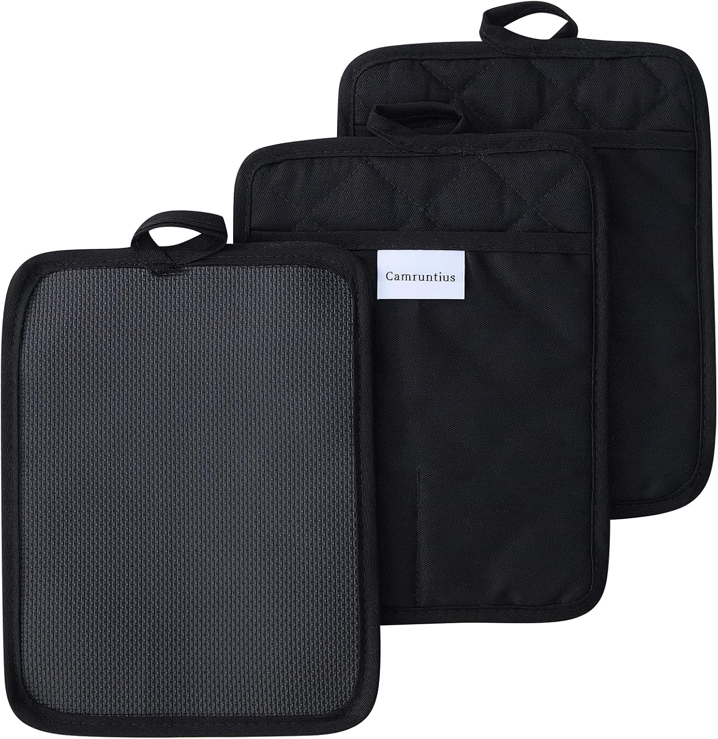 Kitchen Pot Holders, 7"x9", Rectangular with Pocket, Cotton and Neoprene Heat-Resistant Potholders for Cooking and Baking, Machine Washable, 3-Piece Set (Black)