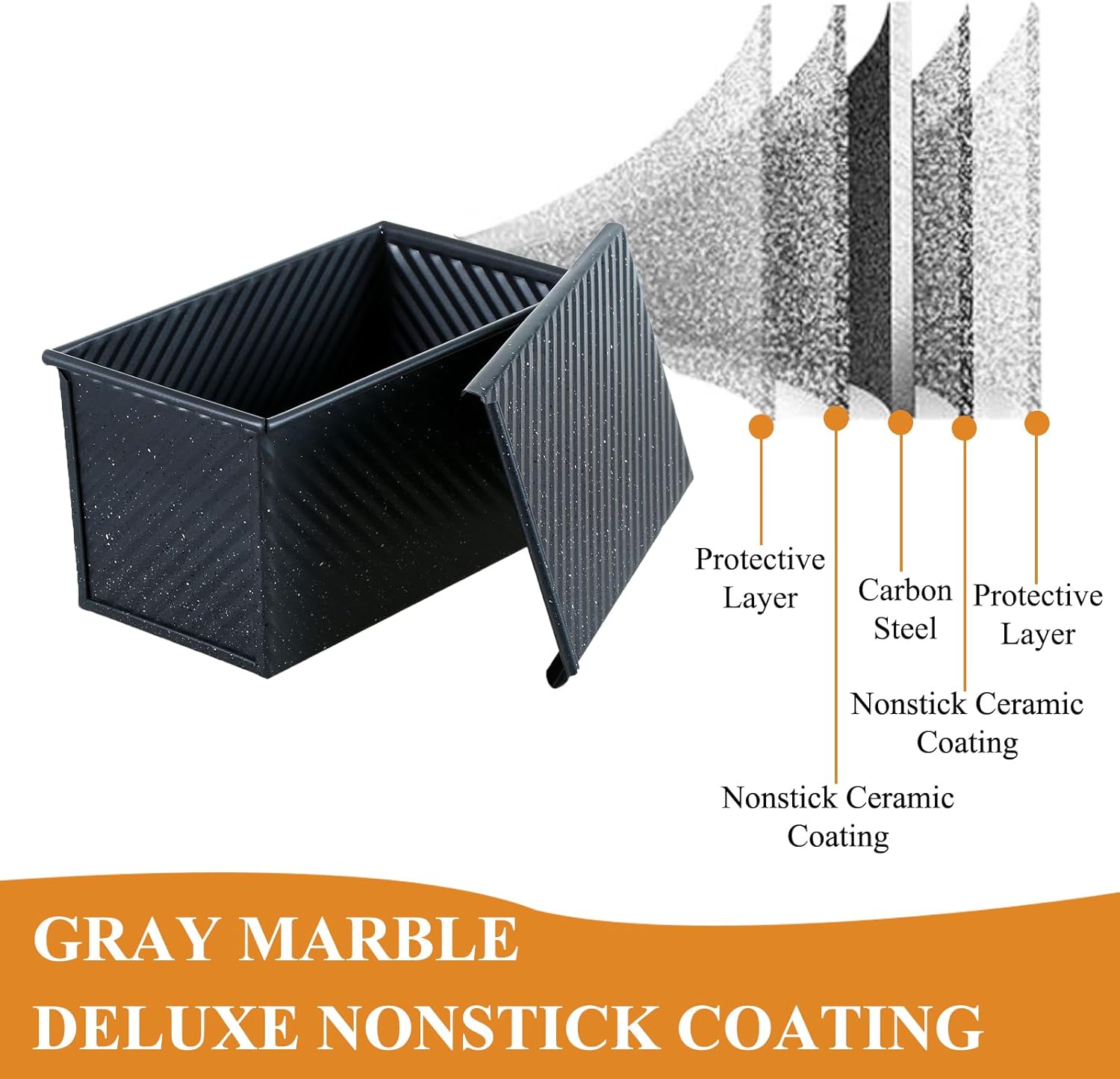 - DOUBLE CAPACITY, ENDLESS OPTIONS: Meet all your baking needs with 2 commercial-grade pullman loaf pans! The 12.5x4.8 inch pan handles 2.2lb dough for family-sized sandwich bread, while the 8.3x4.7 inch pan (1lb capacity) bakes personal sourdough loaves. Durable carbon steel construction withstands 450°F heat for even baking. Includes lids to lock freshness and shape perfect square loaves.