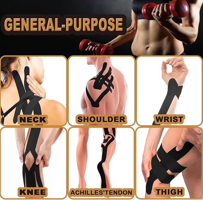 - WIDLY APPLICATION】Kinesiology Tape is used by professional athletes, Physical therapists, and YOU.Designed to provide increase exercise comfort, perform physical therapy, and relieve body pain.for you in some common sports such as football, basketball, swimming, or exercise such as weight lifting, yoga, golf and running.Provides protection for joints,such as elbow, shoulder, wrists, legs, arms, neck, face, ankles, knees, stomach, chest, back, waist, hands, and all kinds of muscles, joints etc.