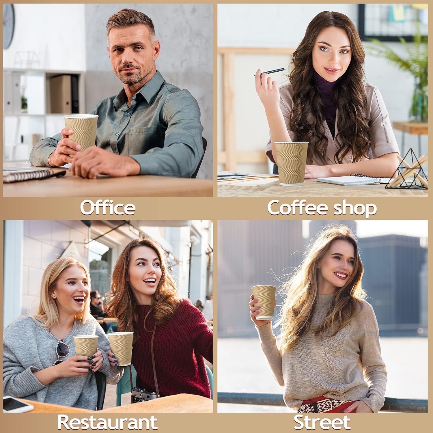 - Insulated Disposable Coffee Cups Design: disposable coffee cups 12 oz are elegant and minimalistic; The S shape pattern elevates the look of your home brewed coffee; With this sleeveless kraft paper hot cup, there is no need for waste of double cups or sleeves; The 3 layers rippled wall keeps the cup cool to the touch to ensure it does not get too hot on the outside, you can hold and drink it comfortably