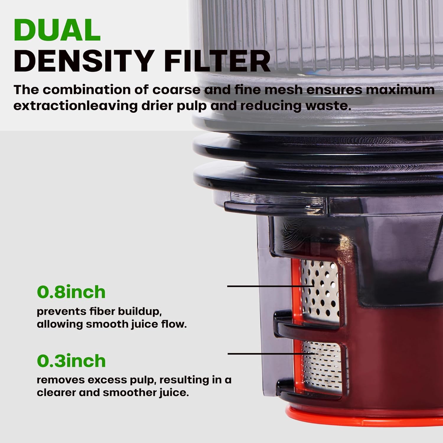 - 【High Juice Yield & Nutrient Retention】: The slow cold press system gently squeezes ingredients without high-speed friction or heat, preserving vitamins, enzymes, and flavor. You'll get up to 99% juice yield with drier pulp, ensuring every drop counts while supporting your wellness goals.Another reason is that the slow juicer significantly reduces the contact of oxygen with fruits and vegetables, thus slowing down the oxidation process. This also means that juice extracted by the slow juicer stays fresh longer when refrigerated.