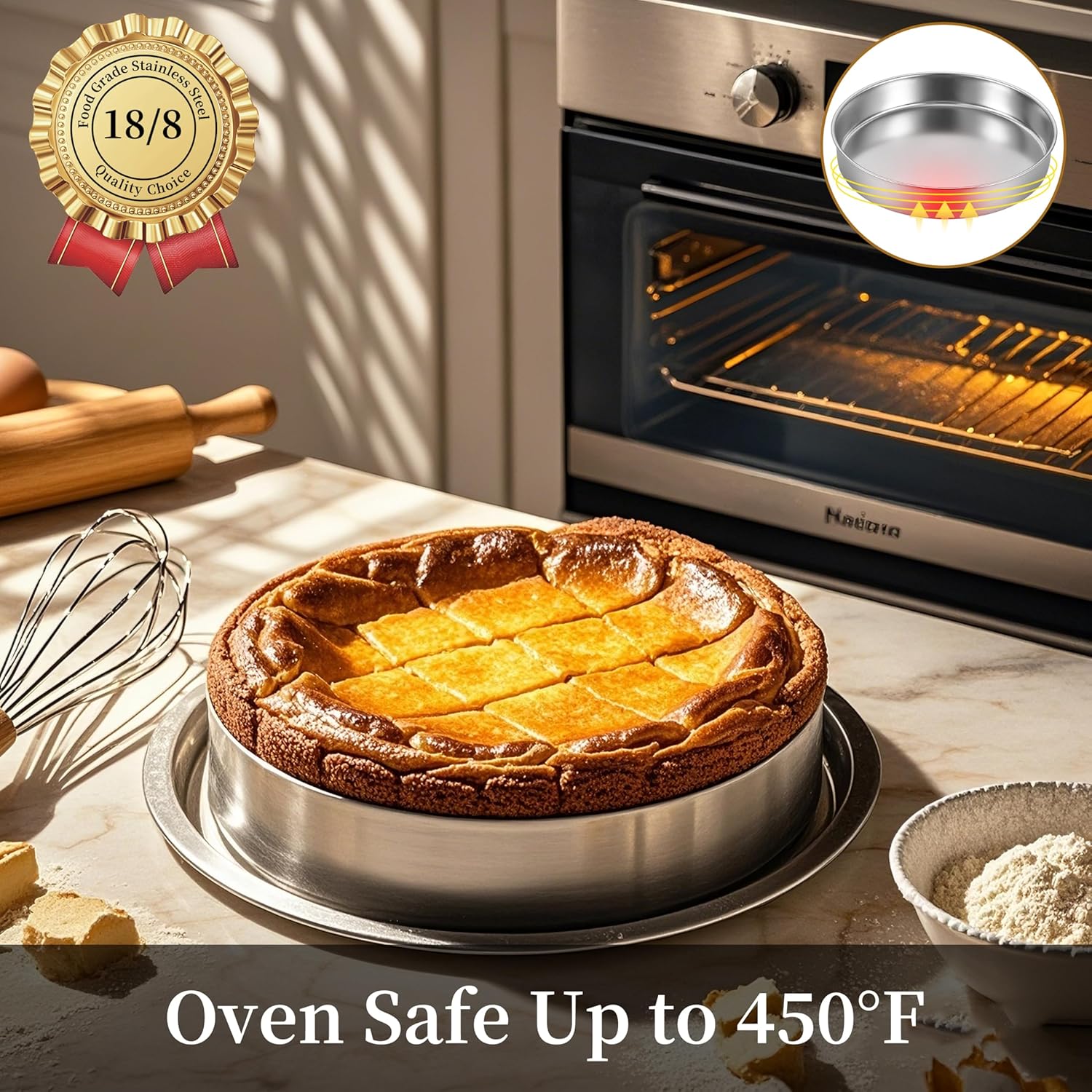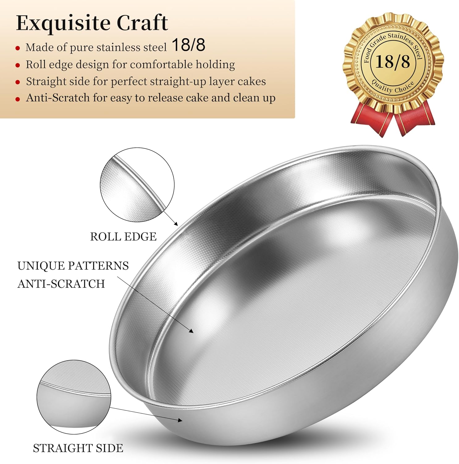 - Crafted Design: Our 18/8 stainless steel round cake pans have unique pattern design to make scratch resistant and reduce the risk of food sticking; Smooth rolled edges make it comfortable to hold and transfer items