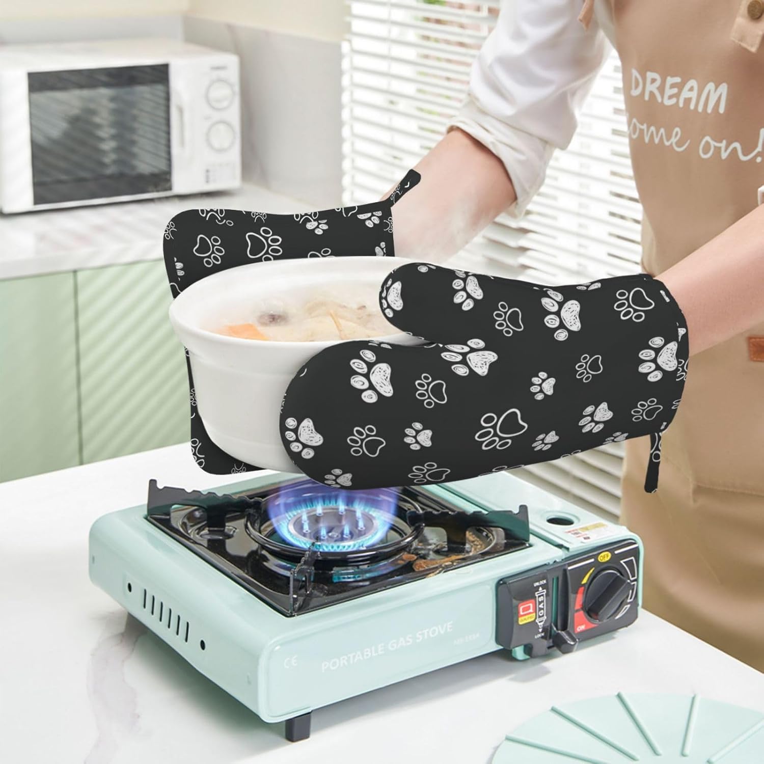 - APPLICABLE SCENARIOS: Dog paw print oven mitts pot holders sets are essential kitchenware for kitchen, BBQ, oven, microwave, family gatherings, parties, birthdays, etc. Colleagues are also great gifts for Mother's Day, weddings, birthdays, holidays, housewarming, and hostess gifts. It is an indispensable tool in baking