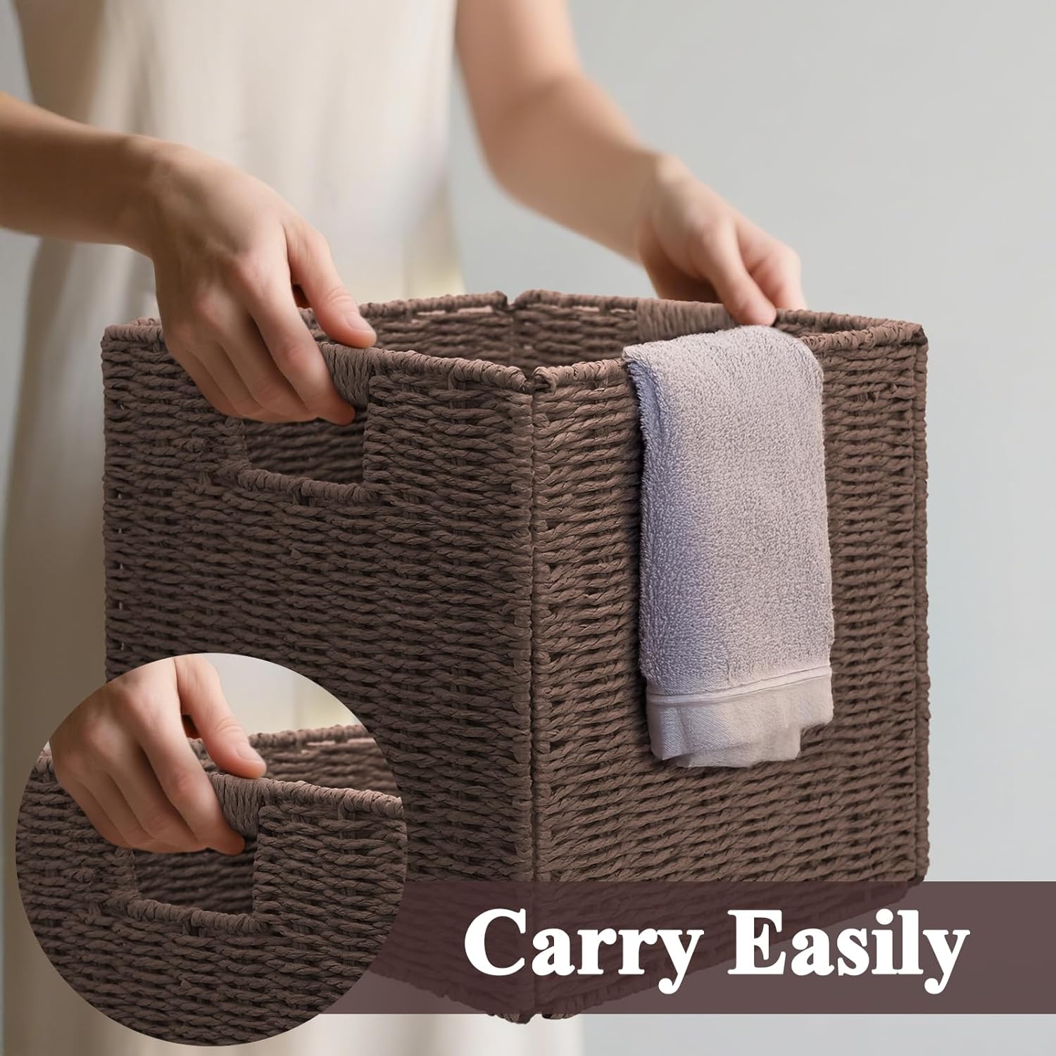 Wicker Storage Baskets for Organizing, 3 Pack Rustic Foldable Square Basket for Shelves, Handwoven Cubby Organizer Bins for Home Decor, Small Cube Storage Bin for Closet Organization (Brown 11 inch)