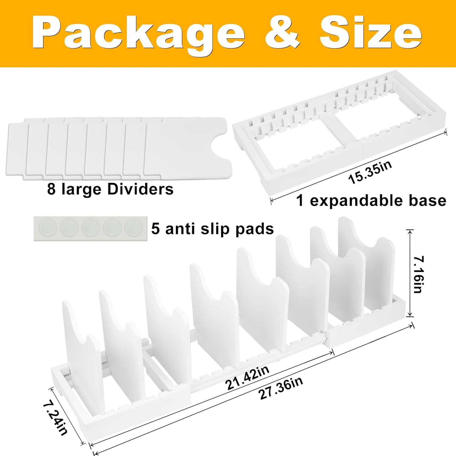 - Easy to Install:No extra tools required. Simply insert the divider into the slot. It also comes with non-slip silicone pads to protect your surfaces and prevent slipping. Equipped with 8 dividers and 25 slots, this is adjustable and expandable to fit various sizes of drawers and cabinet spaces. The non-slip mat is very stable, so you can put it on the cabinet or some other high places with more confidence, so that you can use it more at ease