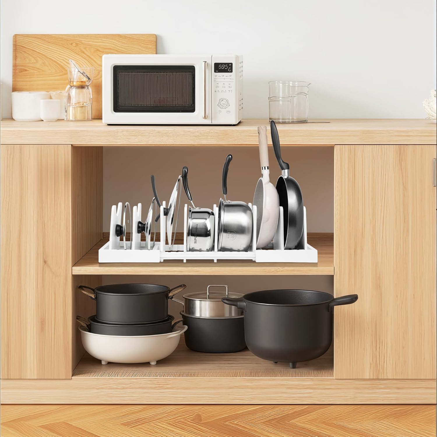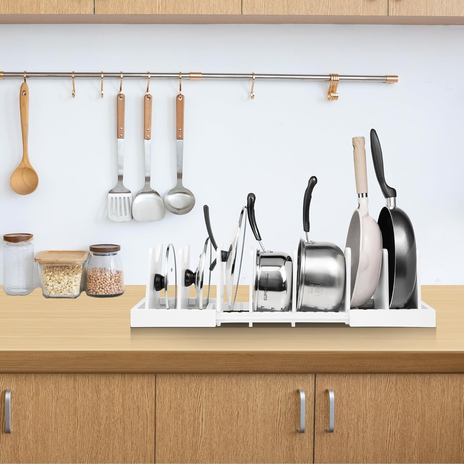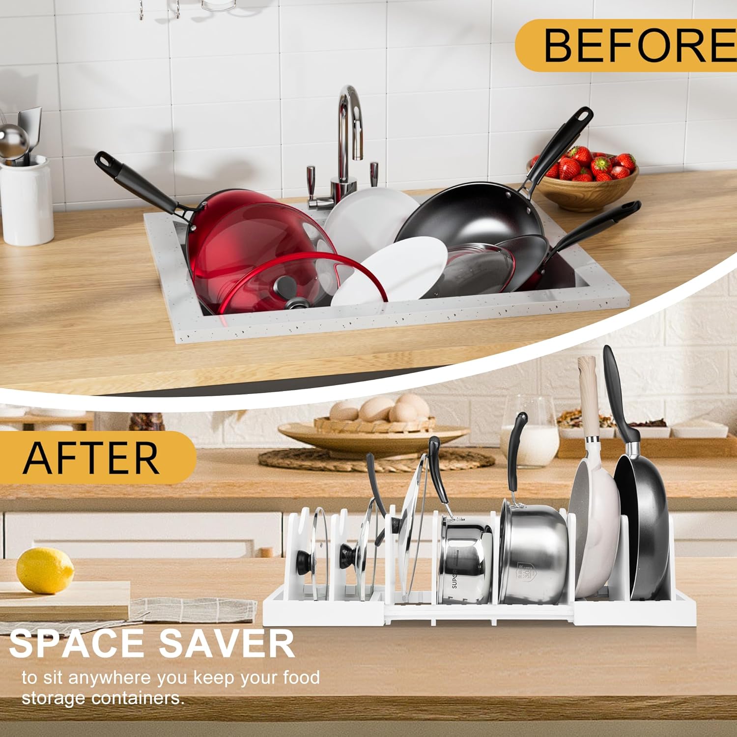 - Widely Used and Stored: Use our pot racks to organize your pots, pans, cast iron, lids, trays and bakeware, it will help you save more cabinet and countertop space in the kitchen,very perfect pan organizer rack for cabinet