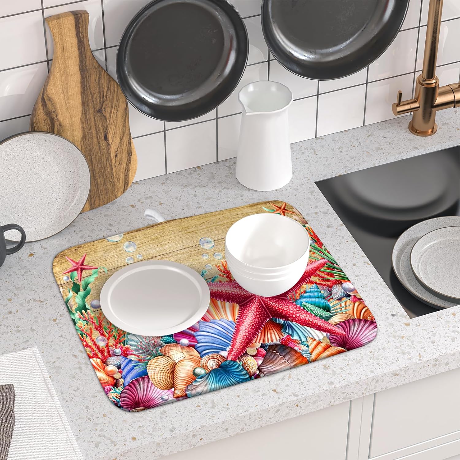 Summer Ocean Dish Drying Mat - Starfish Seashells Absorbent Kitchen Countertop Drying Pad 16 X 18 Inch