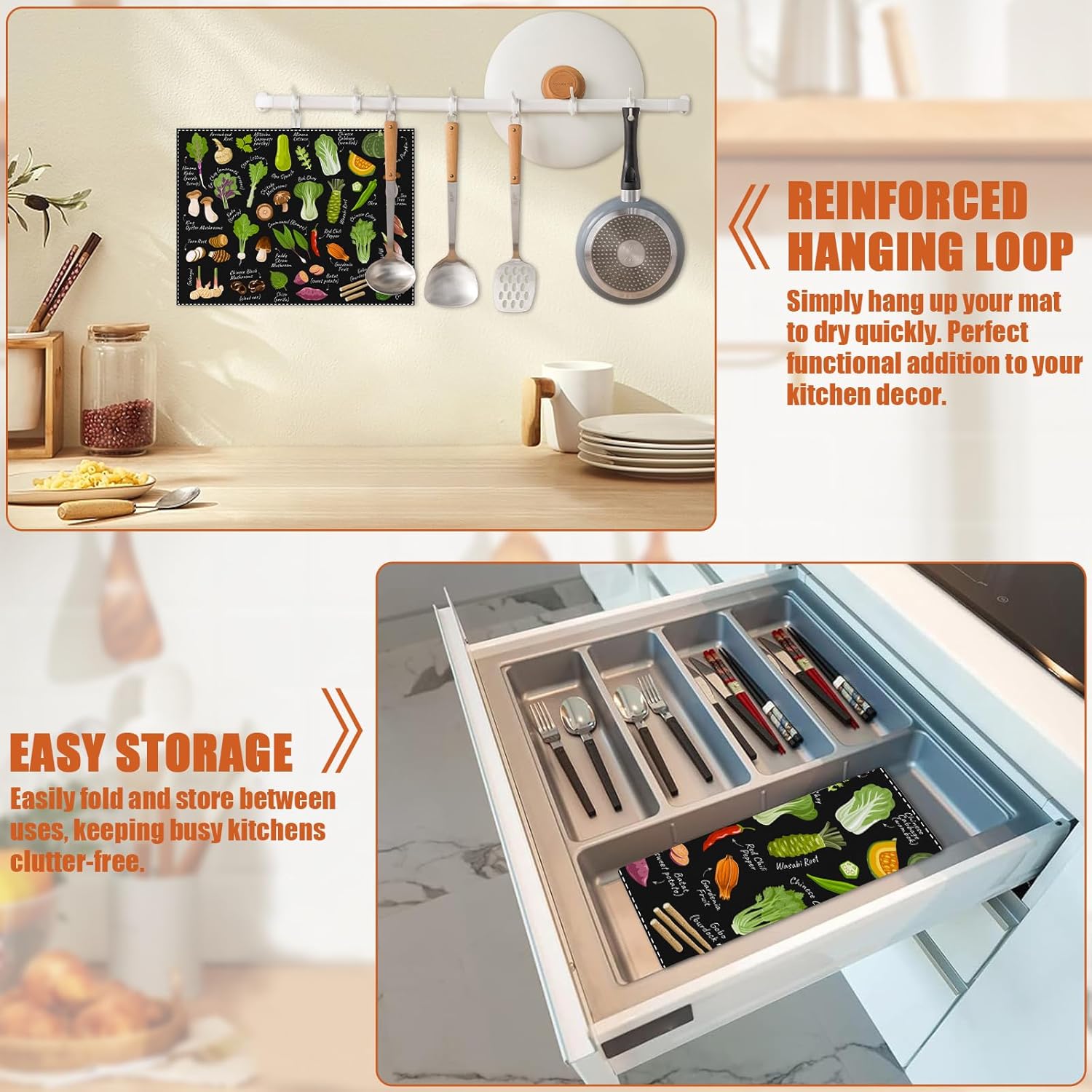 - 【Easy to Clean】The utensil drying mat can be cleaned by hand or machine to remove stains, the kitchen utensil drying mat to dry quickly without a machine. HD printed suede has excellent color lock, does not fade and can be reused many times.