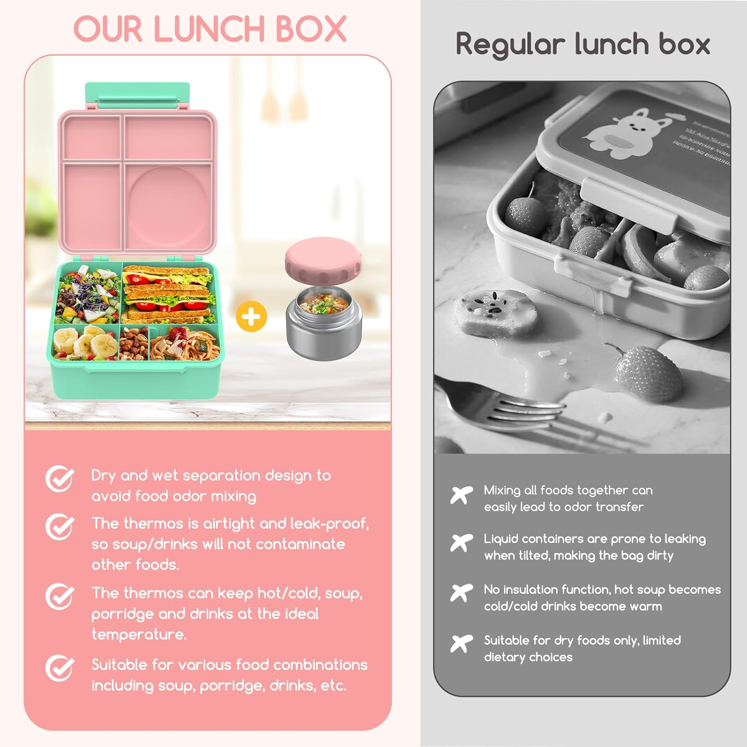 - Bento Box for Kids: This bento box set includes 1 Lunch box, 1 Thermos insert, 1Spoon, 1 Fork and 1 Removable divider. The perfect combination of lunch box and thermos can make children's daily diet more nutritionally balanced, whether it is school lunch, outdoor picnic or long journey. Recommended Age Grade- 3+ Years of Age.