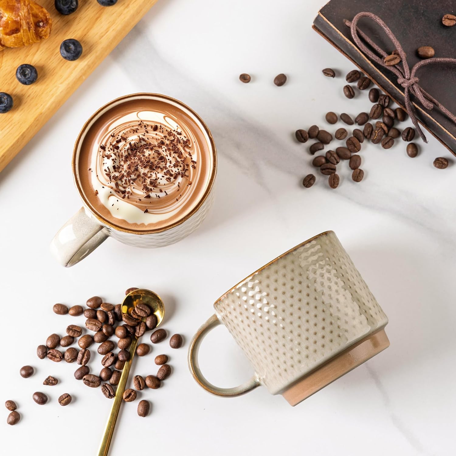 - Stackable and Modern Design: These ceramic mugs feature a beautiful embossed texture design, the smooth rim ensures a comfortable drinking experience, the stackable design allows for easy storage and helps save space in your kitchen.