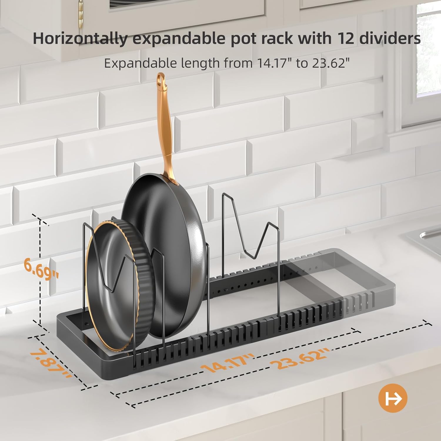 - Expandable Space-Saving Solution: Adjustable from 14.17" to 23.62", PanPanPal pot organizers inside cabinet maximize storage in drawer, shelf, cupboard, or countertop. A versatile pot racks for kitchens of all sizes, keeping cookware tidy and accessible