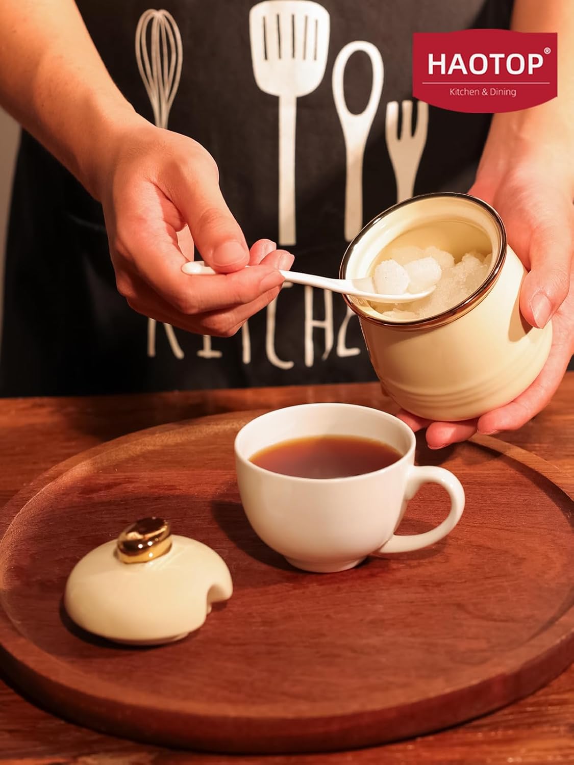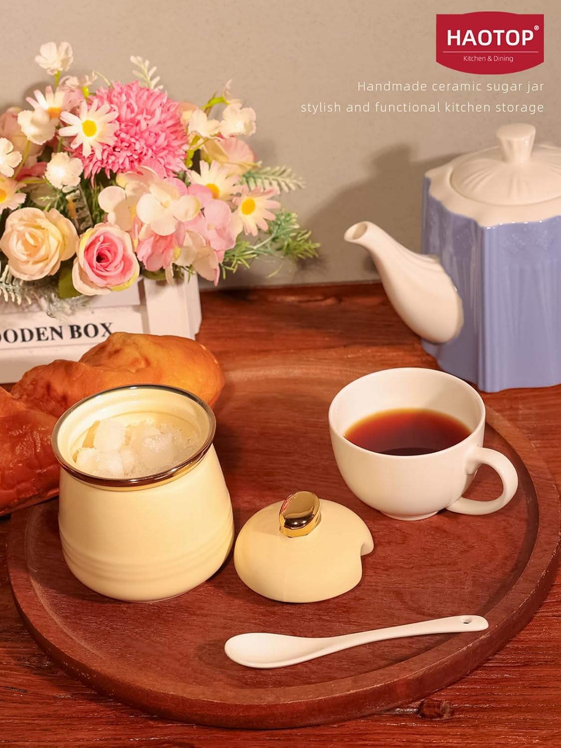 HAOTOP 12oz Sugar Bowl with Lid and Spoon,Simple Ceramic Sugar Jar Sugar Container Sugar Dispenser Coffee Bar Accessories, Modern Kitchen Countertop Canisters, Beige