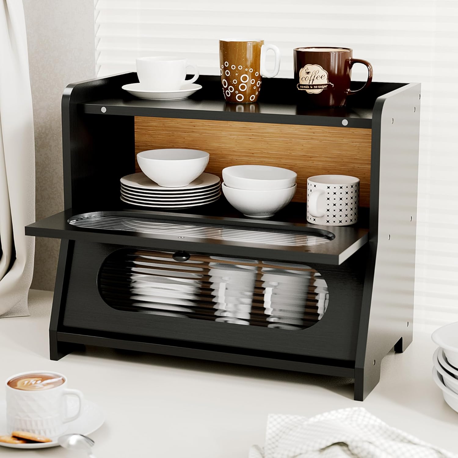 Bread Box for Kitchen Countertop,Double Layer Large Capacity Bamboo Bread Storage Container with Acrylic Wavy Door Panel for Kitchen Counter,Cabinet,Pantry(Black)
