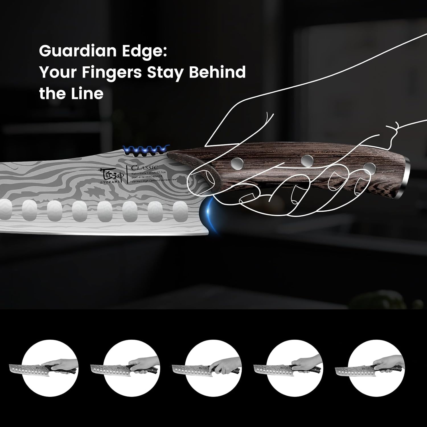 - NON-SLIP CONSIDERATION—We have added a contemporary gear teeth element to this kitchen knife. Combined with the absorbent wenge wood handle, it ensures a stable grip even when the hand or handle is wet, allowing for ease of operation and a sense of security even in a busy kitchen