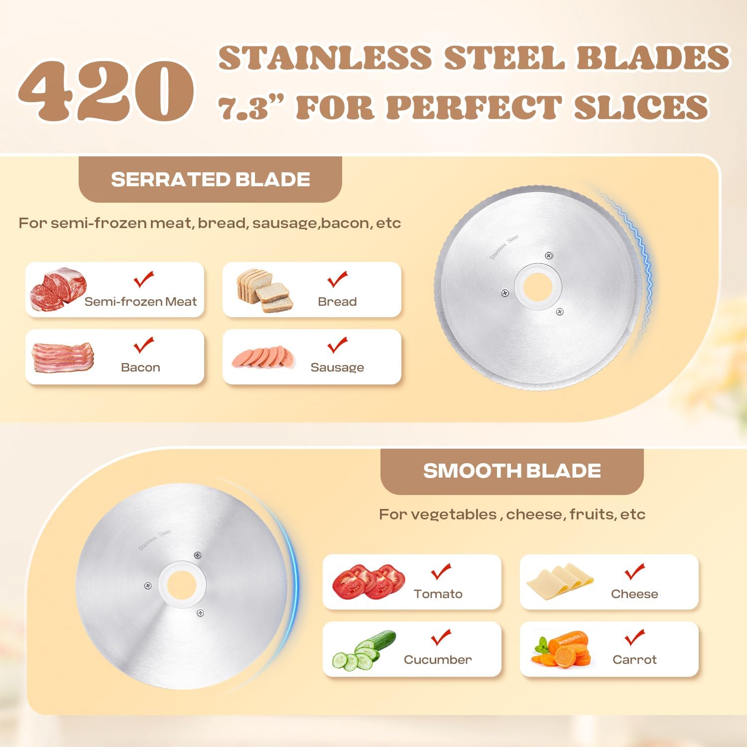 - 2 Removable Blades This meat slicer comes with two 7.3-inch stainless steel blades, each designed specifically for different cutting tasks. The smooth blade is perfect for slicing vegetables, fruits, cheeses, bread, and more. The serrated blade is designed for tackling semi-frozen meats, ham, bacon, roast beef, and other tougher items.