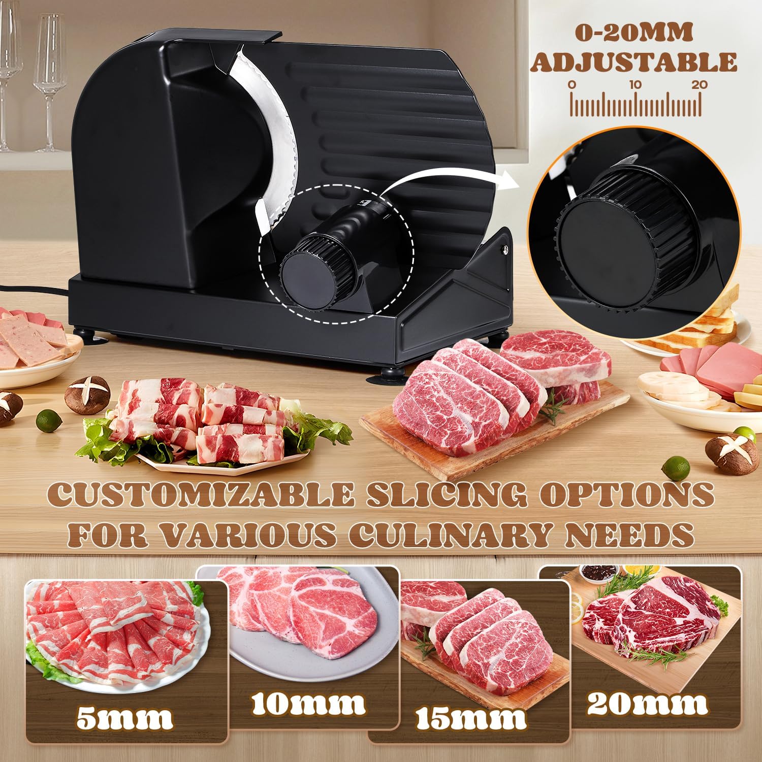 - 1-20mm Adjustable Thickness With the convenient large adjustment knob on the back of the deli slicer, you can effortlessly set your desired slicing thickness, ranging from 1 to 20mm. Customize your slices to perfectly fit any recipe and achieve professional-quality results right in your own kitchen. Enjoy the convenience and precision for every dish.