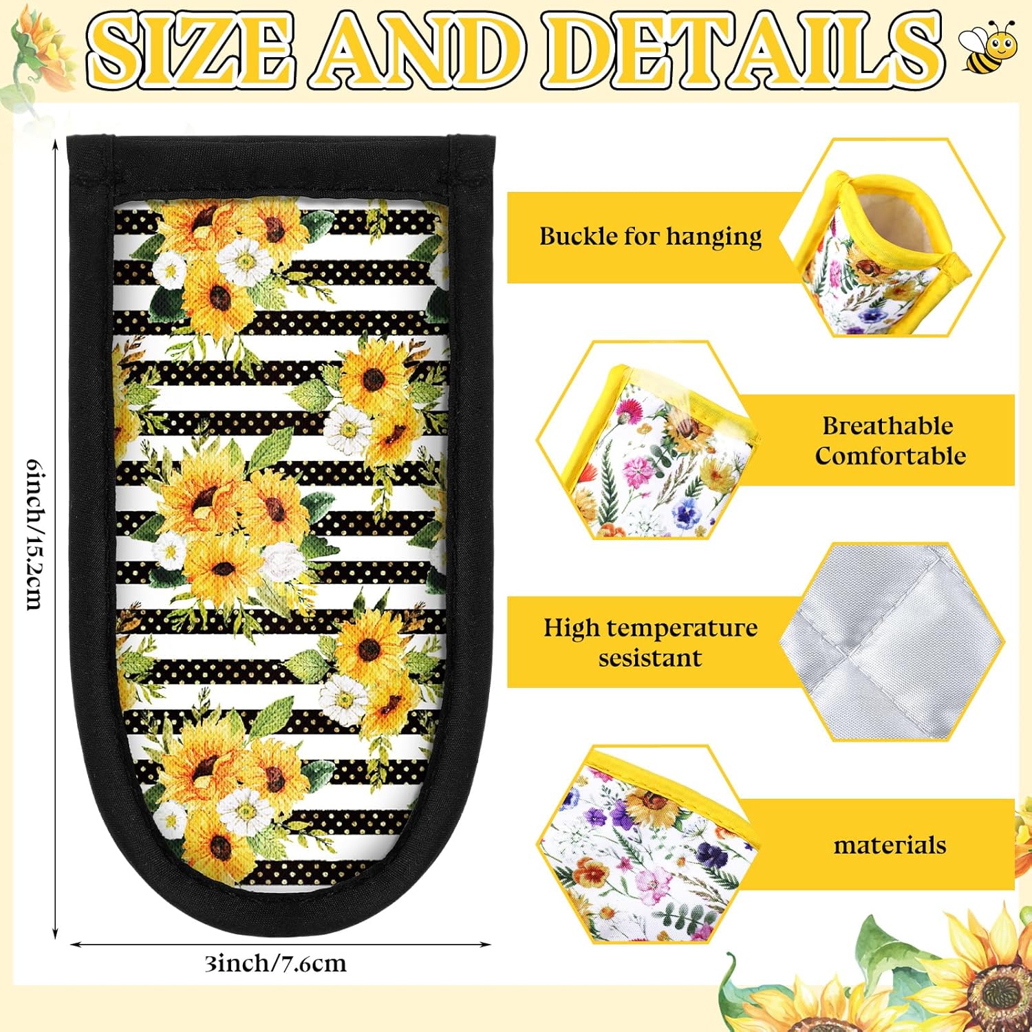 - 8 Different Styles Hot Handle Holders: 8 styles of these pot handle covers heat resistant for you to choose, including sunflowers in different shades, striped sunflowers, bee sunflowers, bees, daisies, spring flowers and summer lemons; You can choose the styles you want to add touch to the kitchen cookware