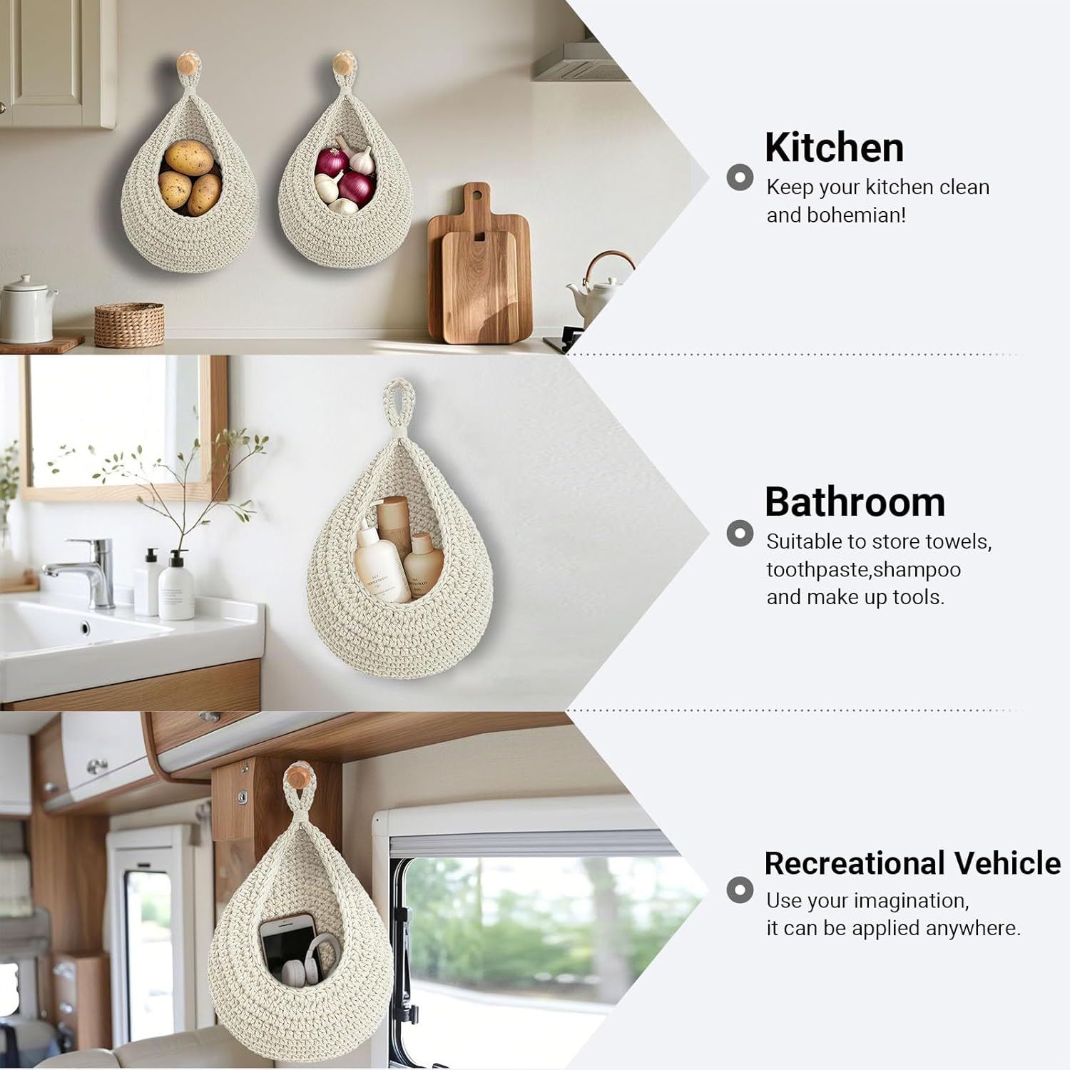- Easy Installation: The product provides 3 pcs strong No-Punch screw stickers and 3 pcs Bohemian-style wooden hooks for free. With two installation methods, it provides you with more usage scenarios and also makes the fruit basket look more beautiful and practical
