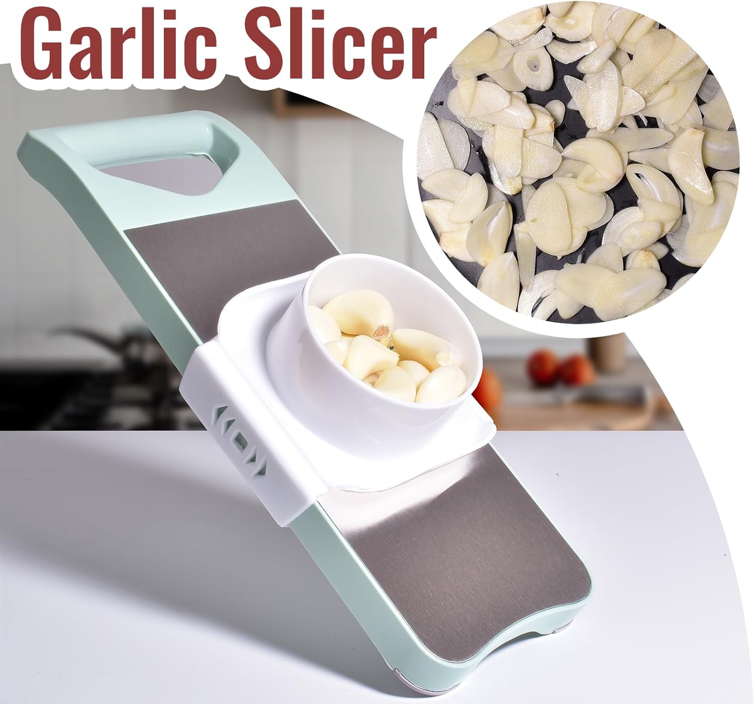 - Slice Garlic Effortlessly & Safely - The pusher/hand guard doubles as a garlic holder, featuring an internal spring that automatically presses cloves against the ultra-sharp blade for complete, even slicing. Choose between two interchangeable thickness blades (1mm/3mm). Perfect for garlic, ginger, and other small vegetables—eliminating uneven chopping and food waste