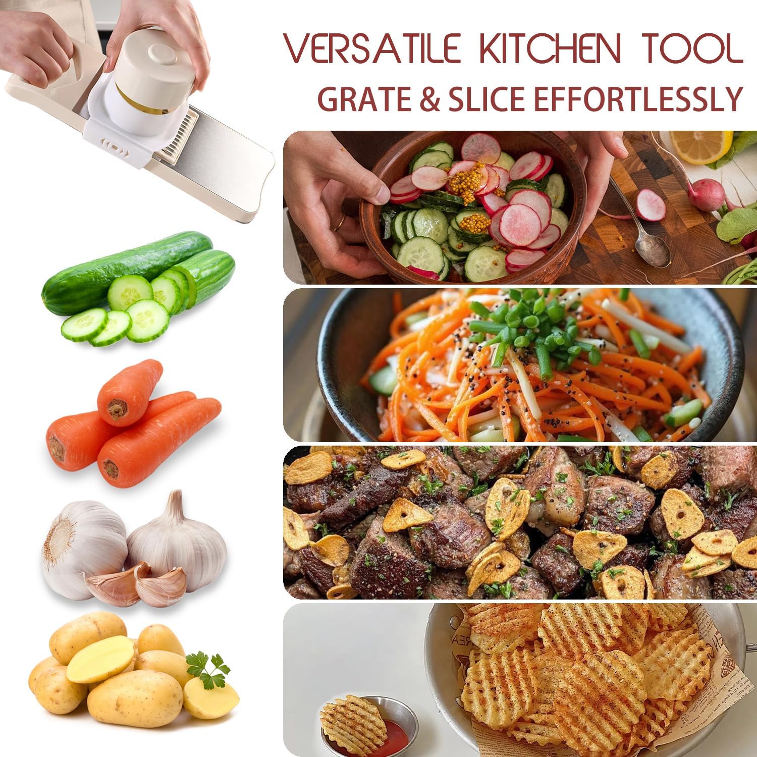 - Slice Garlic Effortlessly & Safely - The pusher/hand guard doubles as a garlic holder, featuring an internal spring that automatically presses cloves against the ultra-sharp blade for complete, even slicing. Choose between two interchangeable thickness blades (1mm/3mm). Perfect for garlic, ginger, and other small vegetables—eliminating uneven chopping and food waste