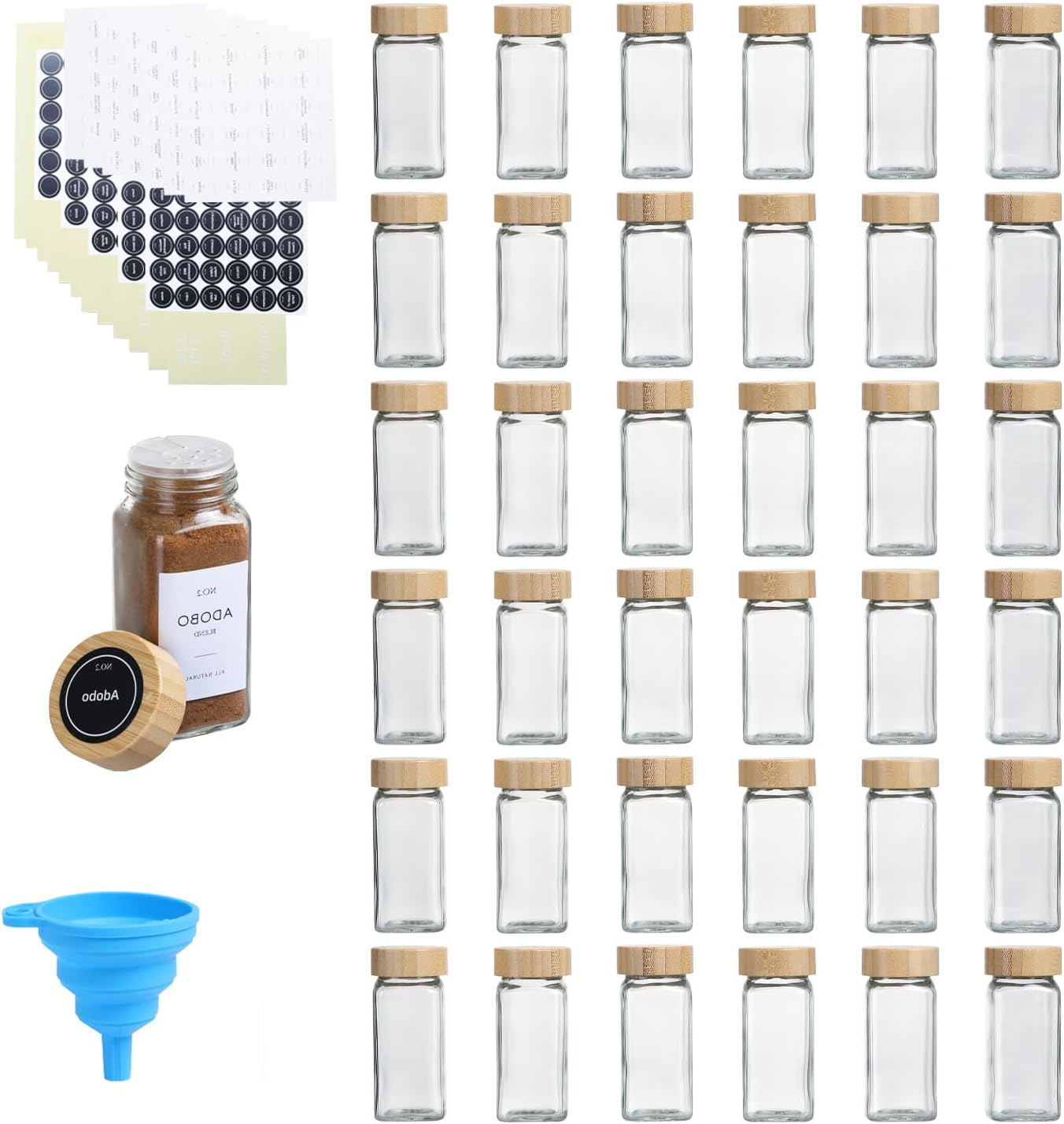 - Complete Organization Kit:Includes 36 square glass spice jars, 36 shaker lids, pre-printed labels (3 styles) and 1 collapsible silicone funnel. Every essential for seamless spice management – no additional purchases required.