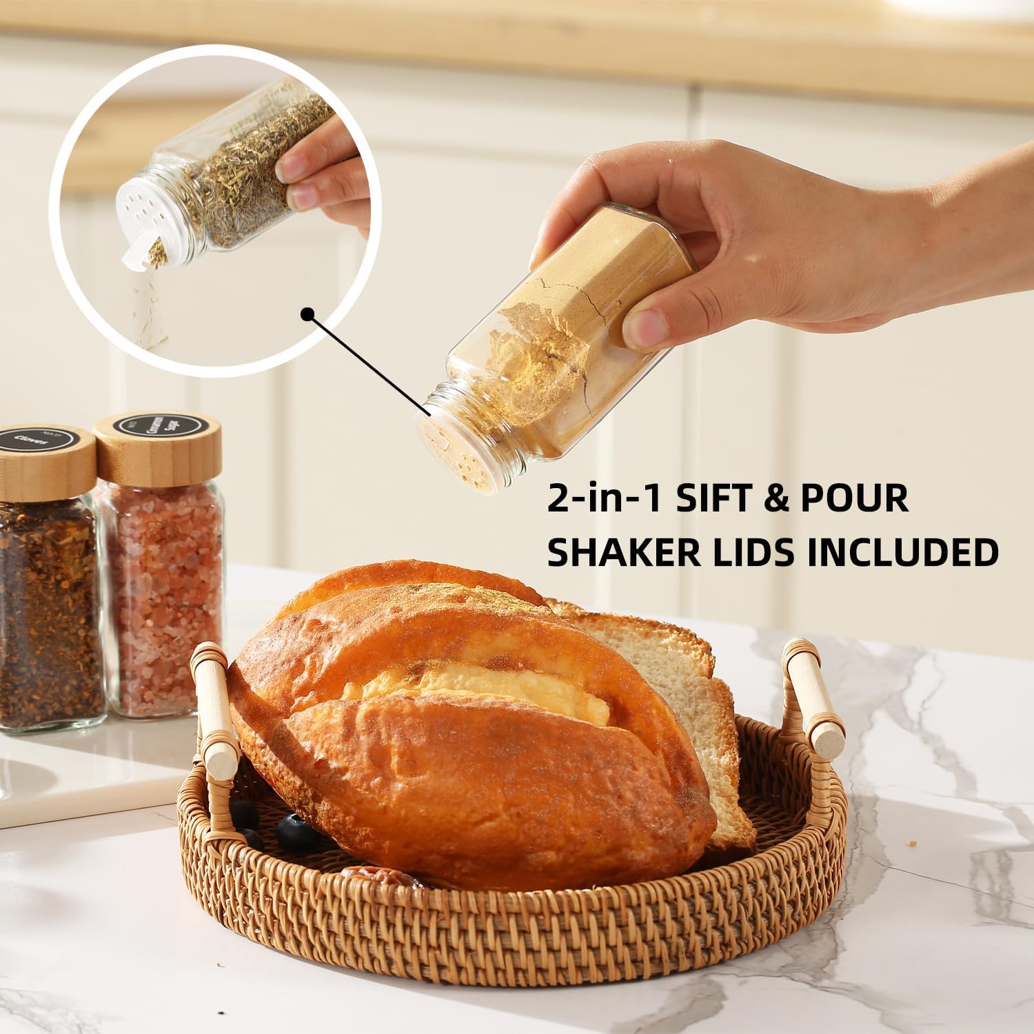 - Versatile 2-in-1 Shaker Lids:Features a dual-aperture system – fine holes for powdered spices and a flip-top for herbs/grains. Switch modes instantly without changing lids. Bamboo lids maintain freshness with airtight seals.