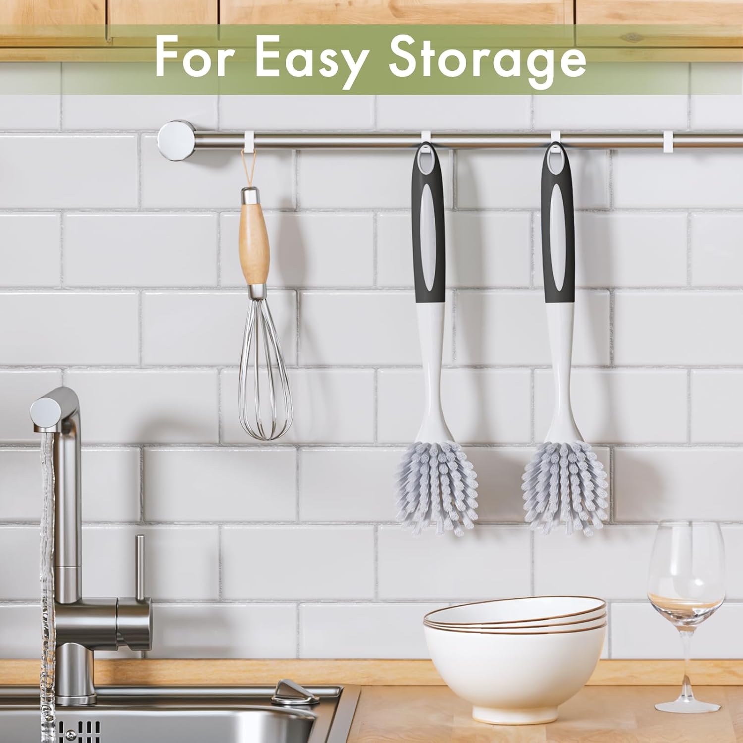 - Dish scrubber with loop handle: Dish washing brush scrubber with loop long handle can be hung over the sink to keep dry and clean. The long handled brush protects your hands from getting wet and touching the washing-up liquid while cleaning most things.