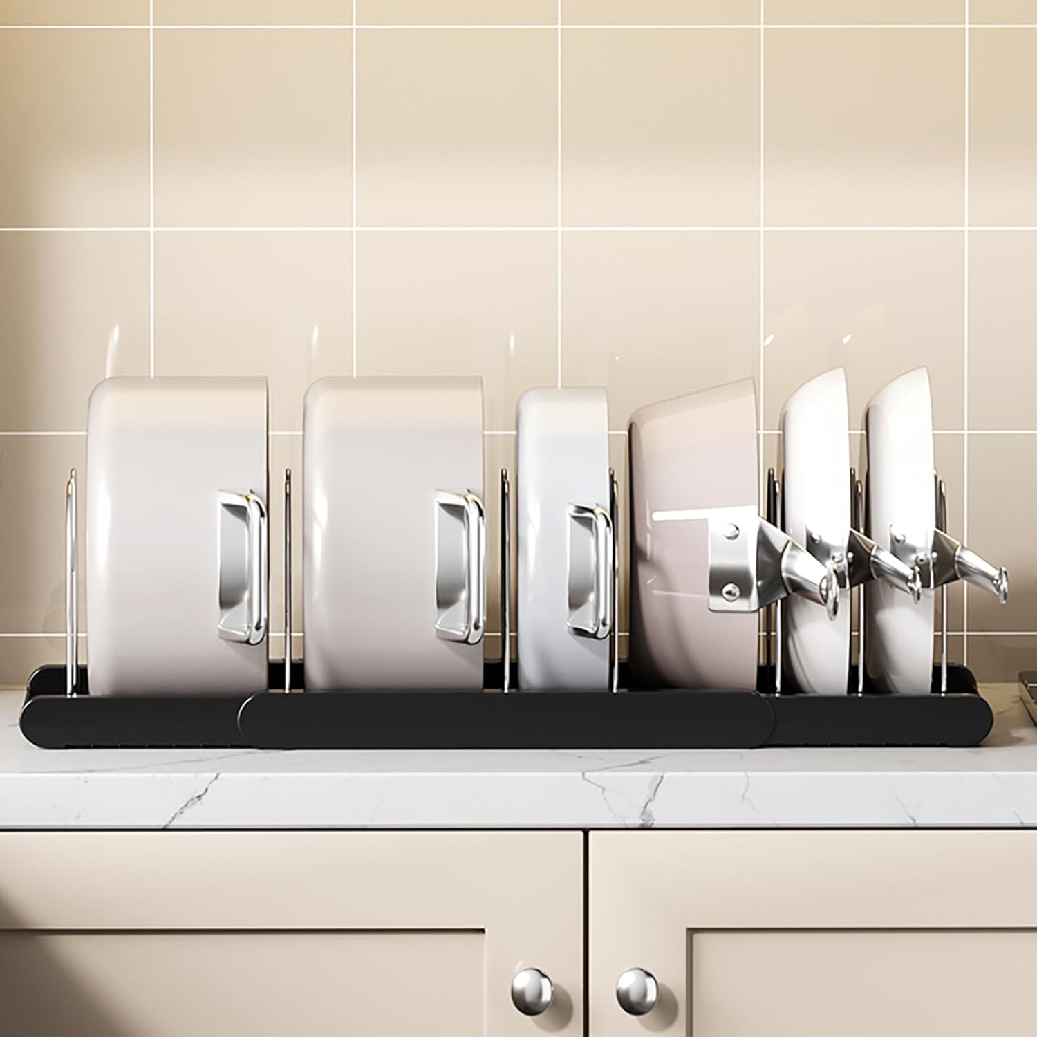 - Pan organizer rack is suitable for organizing pans, lids, cutting boards, baking sheets, cookware in cabinet, under-sink, shelves, drawers and countertops