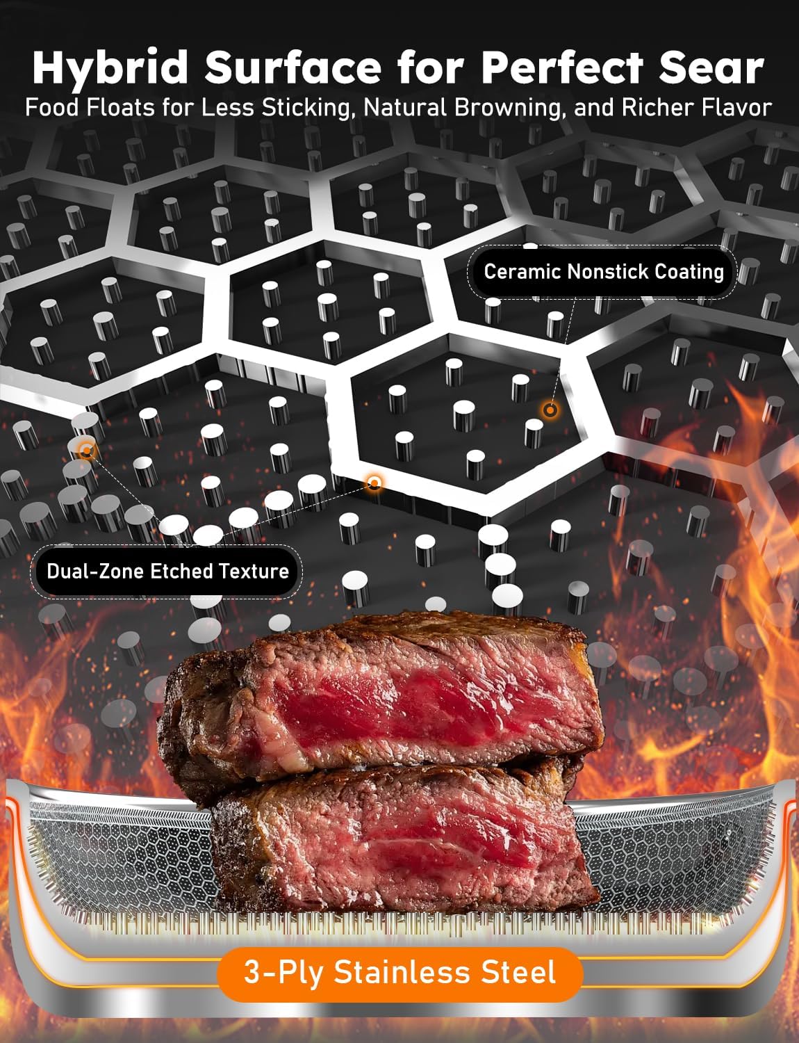 - 3-PLY STEEL FOR PERFECT SEARING: This premium Skillet features a 3-ply stainless steel core and 2-layer ceramic coatings, with a full-surface dual hexagon texture of variable heights that lifts food to reduce sticking and protect the bottom coating from wear. Compared to typical aluminum core fry pans, its 3-ply stainless steel core extends the lifespan up to 5X longer, making it perfect for frequent high-heat searing, grilling, frying, while delivering natural browning and richer flavor