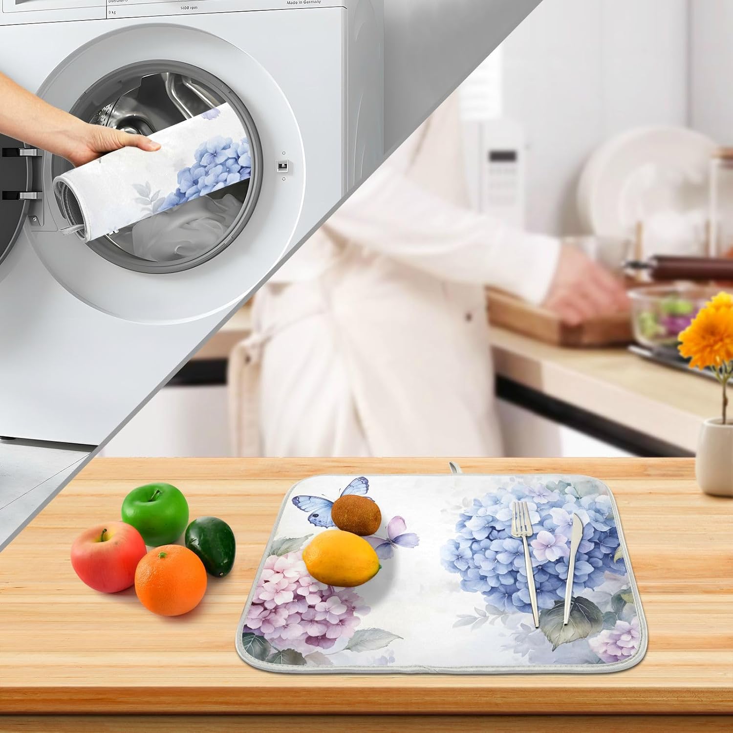 Blue Pink Hydrangea Spring Floral Dish Drying Mat for Kitchen Counter Absorbent Microfiber Small Drying Pad Dish mats for Kitchen Countertops 16 x 18 Inch