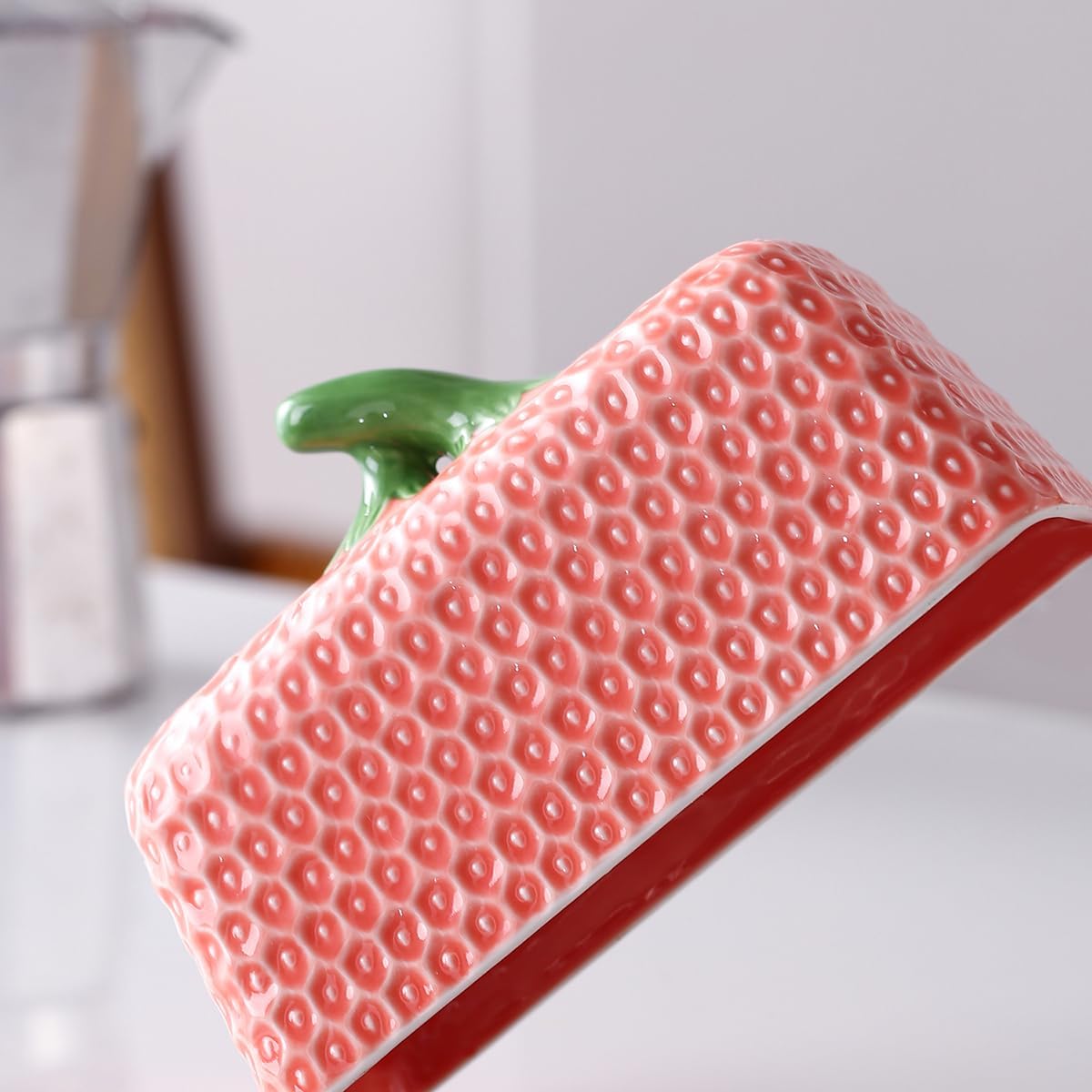 - Unique Design: Unique Design: This butter dish features a distinctive strawberry-inspired shape with a charming two-tone color combination. Both the lid and handle are hand-painted by skilled artisans, showcasing exquisite craftsmanship. It’s not only visually appealing but also highly practical, adding a lively pop of color to your kitchen.