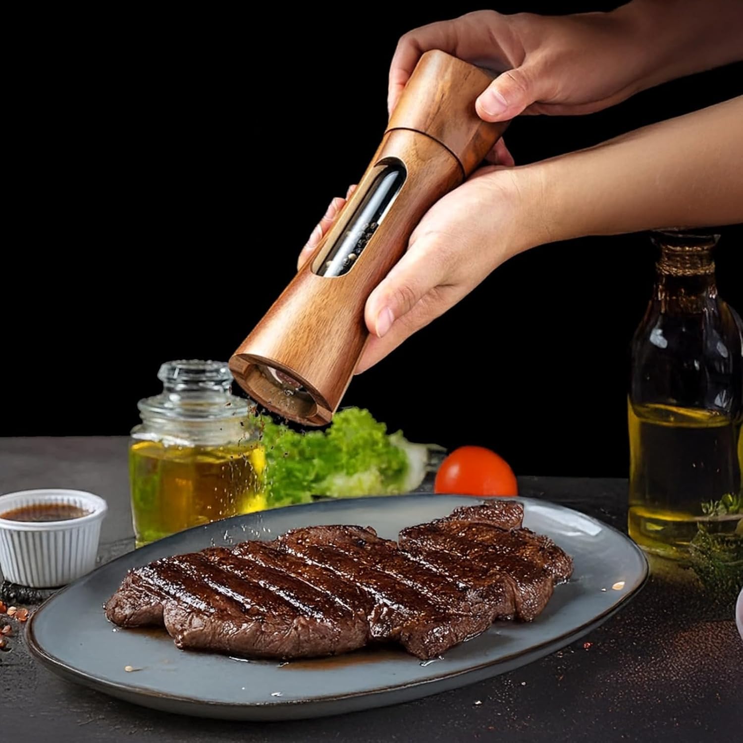 - Elegant and Practical: Includes a stylish wooden base with two grooves; neatly holds both grinders; transparent windows allow easy viewing of spice levels; perfect gift packaging