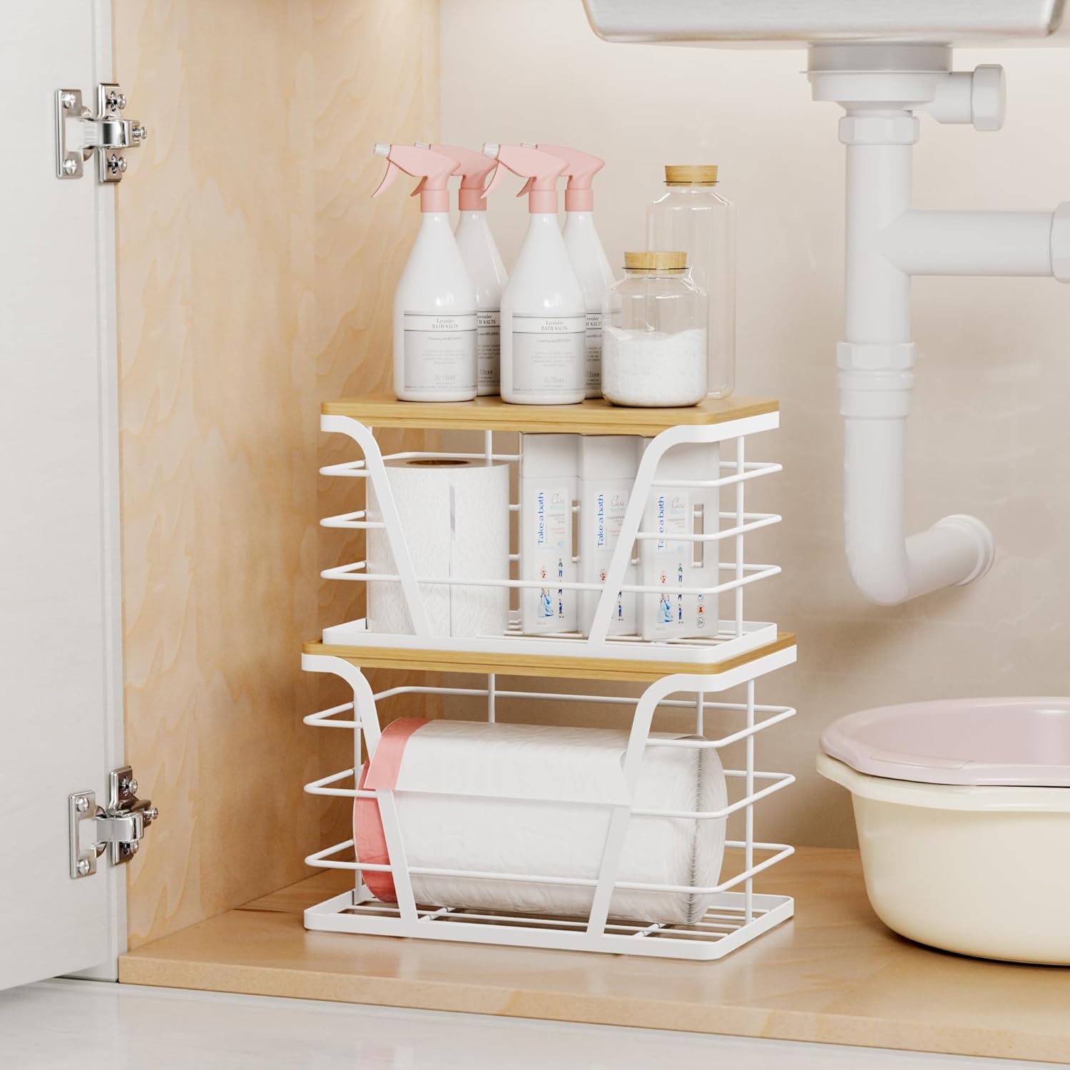 - Thoughtful Design:The large garbage bag holder’s removable bamboo cover to hold smaller units in place, creating a sturdy under sink organizer tower. Perfect for laundry storage rooms or pantry organizers and storage