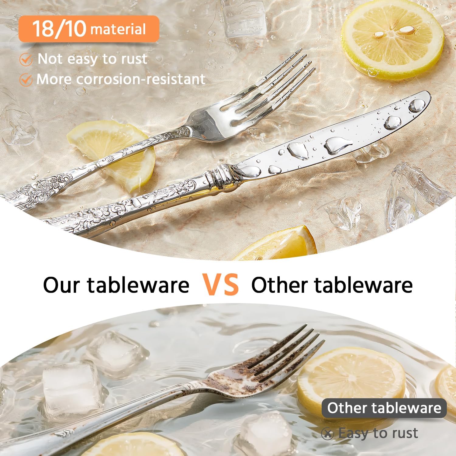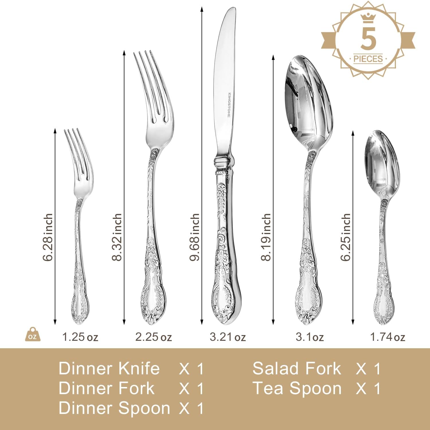 KINGSTONE Vintage Carved Silverware Set, 5-Piece 18/10 Stainless Steel Flatware Cutlery Set with Retro Royal Thick Handle, Tableware Utensils for Home, Restaurant, party, Wedding, Dishwasher Safe