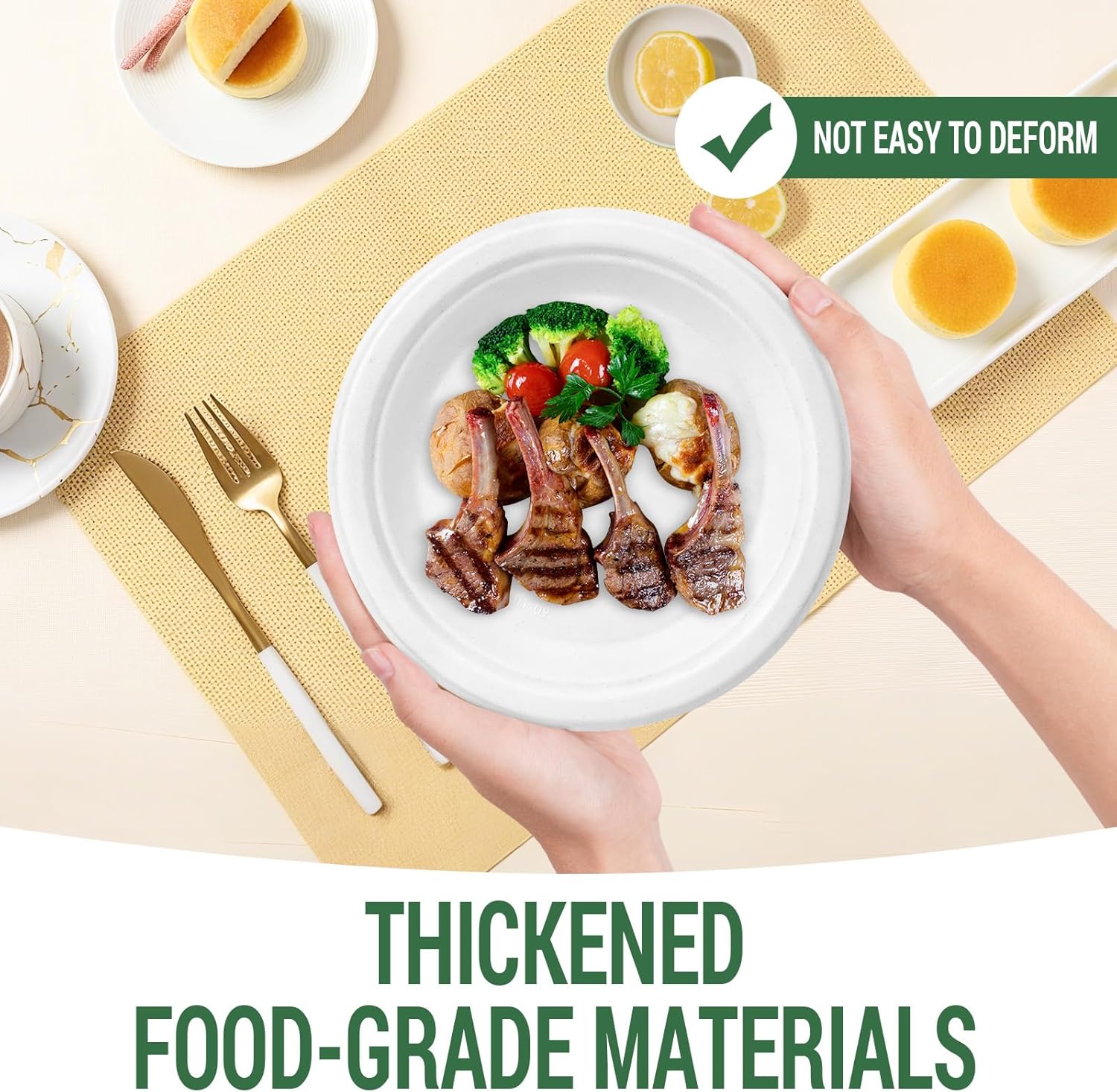 50 Compostable Paper Plates, Includes 25-9" & 25-7" Heavy Duty Disposable Plates, Biodegradable Sugarcane Bagasse, White