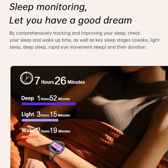 - More Efficient Life --- The outdoor sports watches has many built-in functions including smart notifications, music control, camera control, sedentary reminders, alarm clock, stopwatch, sleep monitoring, etc. At the same time, the rugged smartwatch adopts a fully enclosed 5ATM waterproof design so that you can wear it with confidence for daily water sports such as swimming