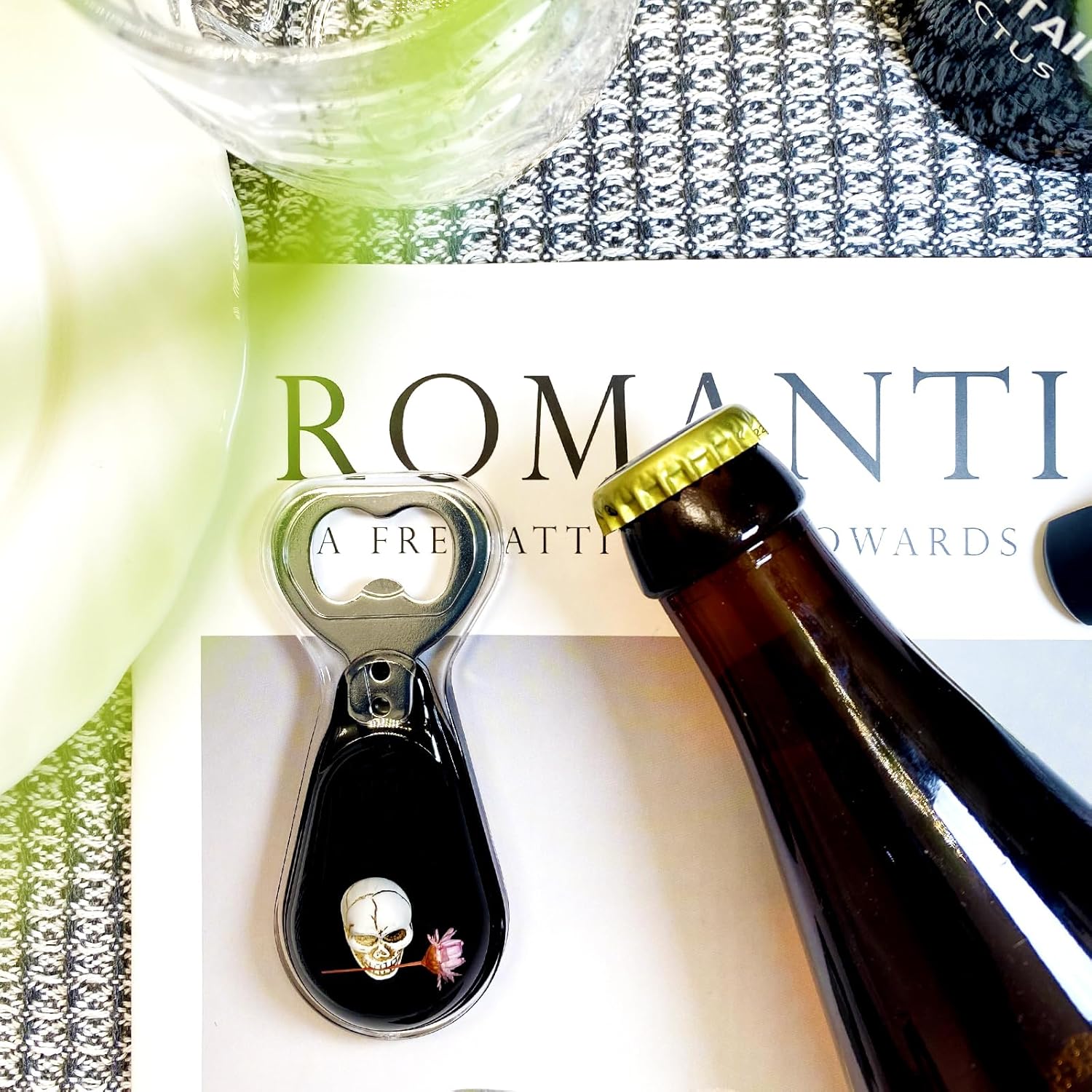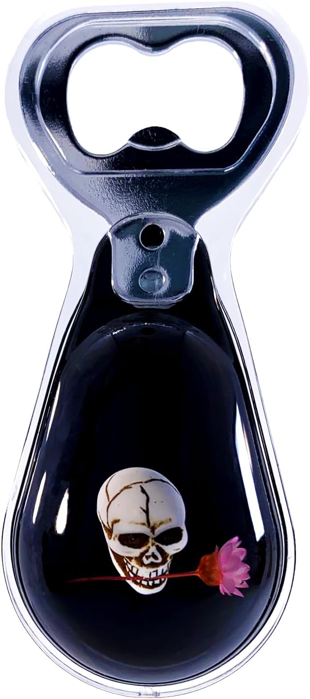 Halloween Ghost Skull Decor, Magnetic Bottle Opener, Original Design Skull Biting Flower in Black Resin – Strong Magnet for Fridge – Gothic Halloween Gifts - Black