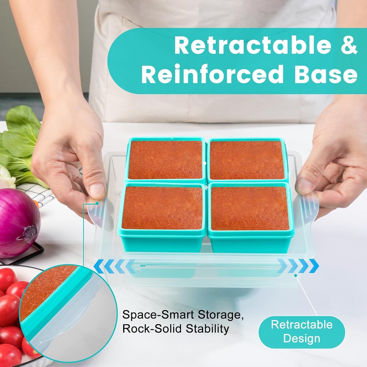 - Space-Saving & Organized Storage: Features a retractable reinforced base for stable food transport and an adjustable sizing system to conform to fridge space. These stackable silicone freezer trays consolidate fridge/freezer storage efficiently