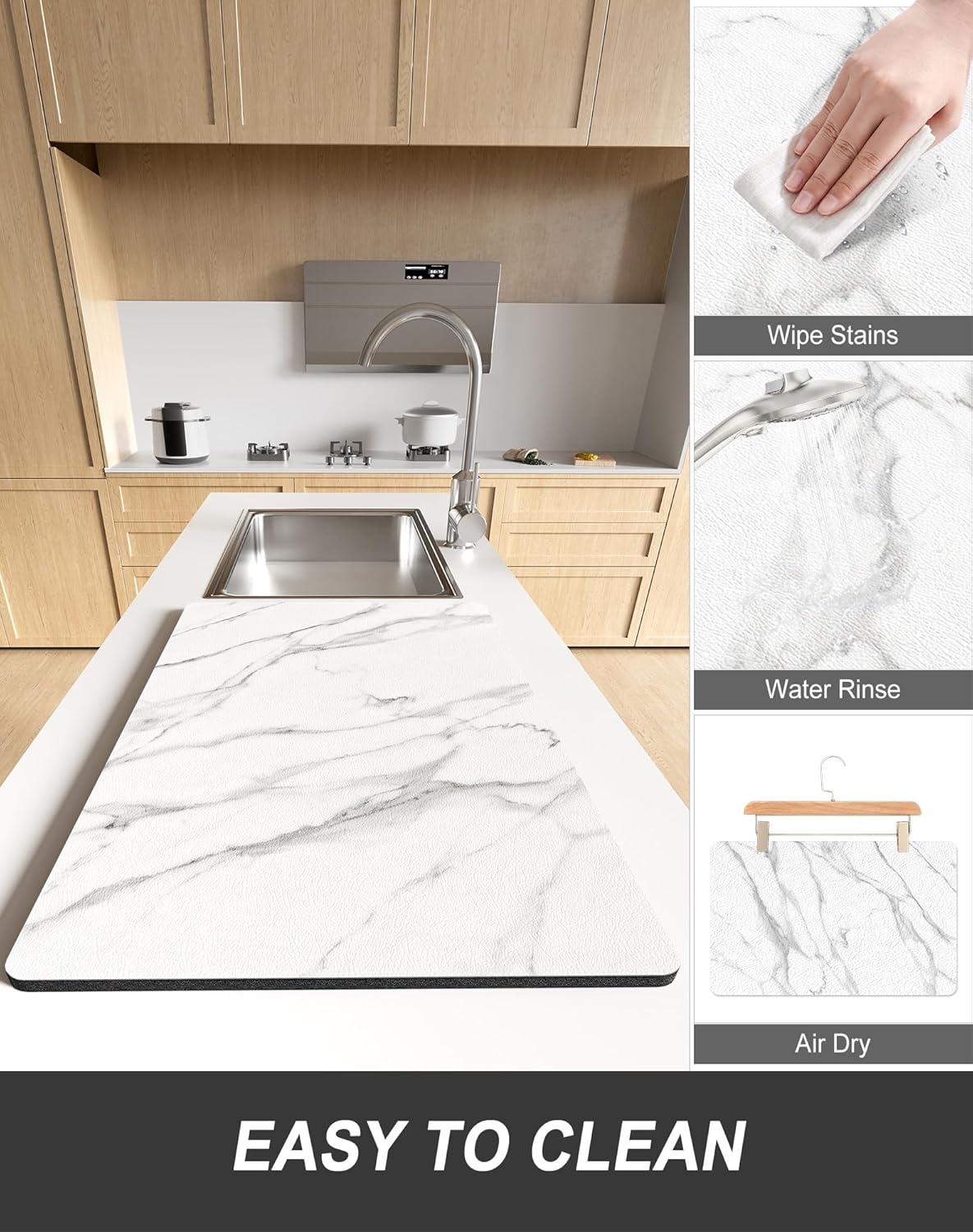 Rnivvi Dish Drying Mat for Kitchen Counter, XL 15 x 24" Cute Marble Super Absorbent Draining Pad, Non-Slip Heat Resistant Coffee Bar Mats for Coffee Machine Station Accessories, White Dish Rack Pad