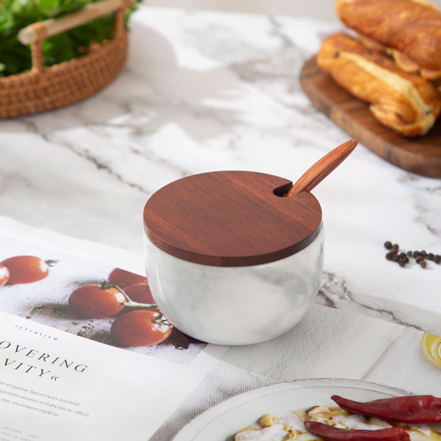 - The salt cellar is made of natural marble by hand grinding, with a polished exterior. Each is unique, and the cover is made of high-quality natural bamboo to keep out dust or bugs.