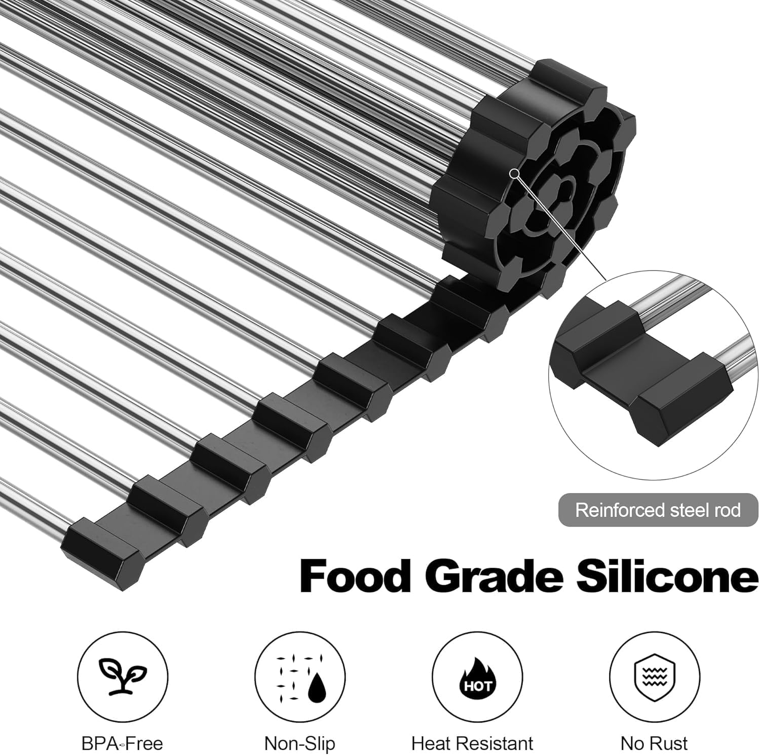 - The construction of the BPA-free silicone covered stainless steel rods allow water to drain into the sink below. The silicone grips your countertops to keep the drying rack in place without scratching