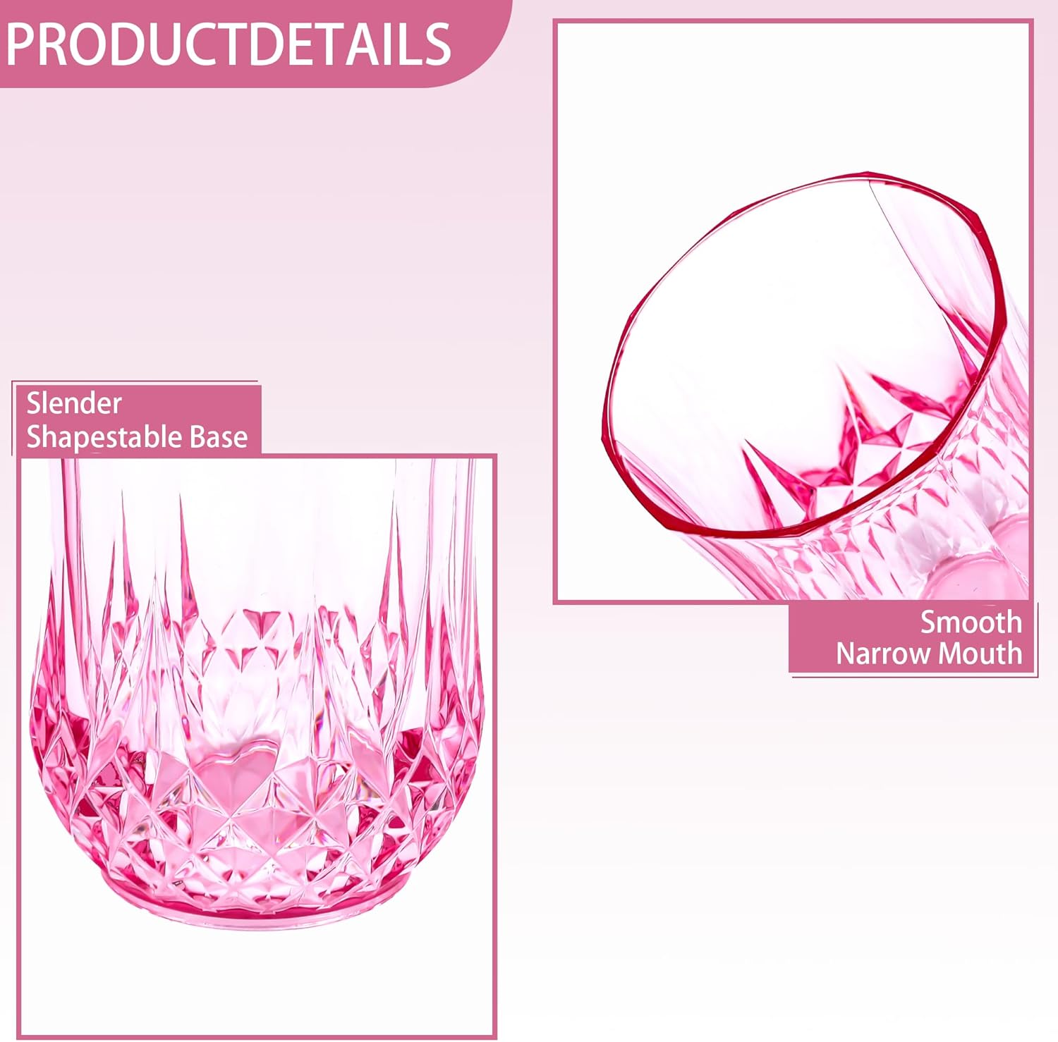 - 🍷🍷🍷Suitable Size: The exquisite plastic drinking glasses have a diameter of approximately 2.59 inches and a height of about 3.42 inches, with a capacity of 9 ounces. The mouth is smooth and won't damage your lips. Pink wine glasses are suitable for various beverages such as wine, champagne, whisky, holiday cocktails, etc. The handleless cup adds a touch of fashion to your party and leaves a deep impression on your guests