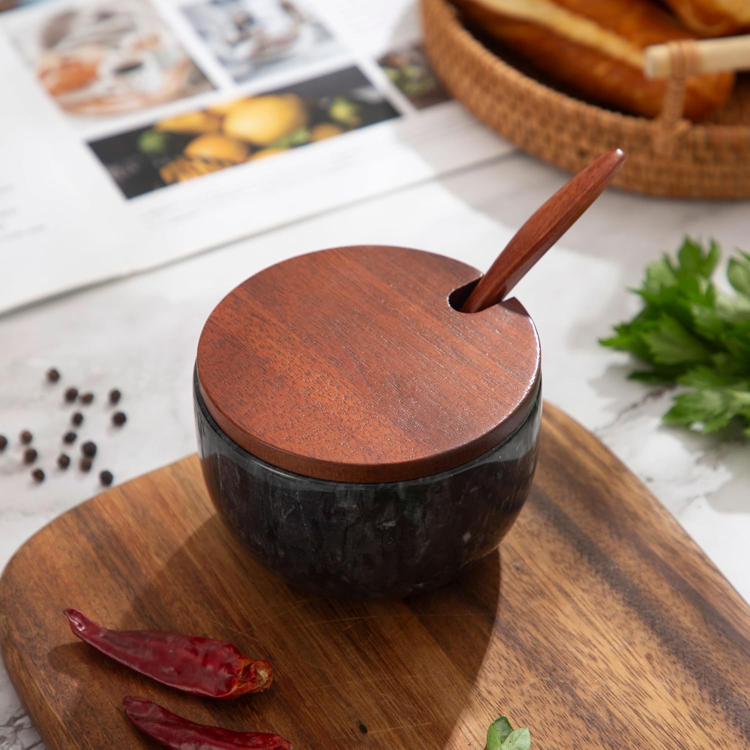 Marble Salt Cellar with Lid & Spoon, 11oz Salt and Pepper bowls, Handcrafted from Natural Marble, Smooth Inside (black bowl)