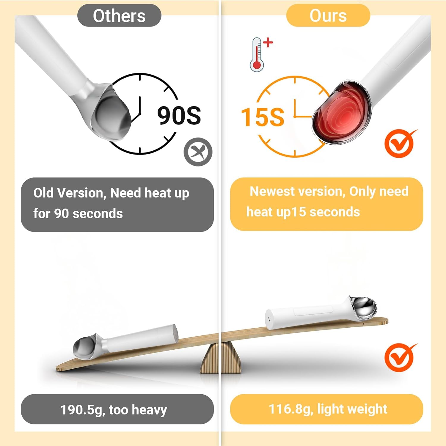 - 15 Seconds Effortless Heated Scooping: This upgraded heated ice cream scoop rechargeable heats to 158°F in just 15 seconds, compare with the old version need 90 seconds heating, gliding through even rock-hard ice cream with ease. No more bending spoons or waiting for thawing—scoop perfect rounds instantly